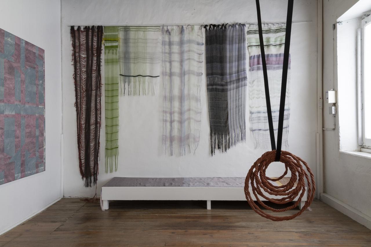 1 0 1 0 1 0 0 0 1, 2023, reconstituted painting no. 2 (left) ; different weavings, 2021 - 2023 (in the middle) ; collagène, 2023, installation, ceramics, straps, (right)
