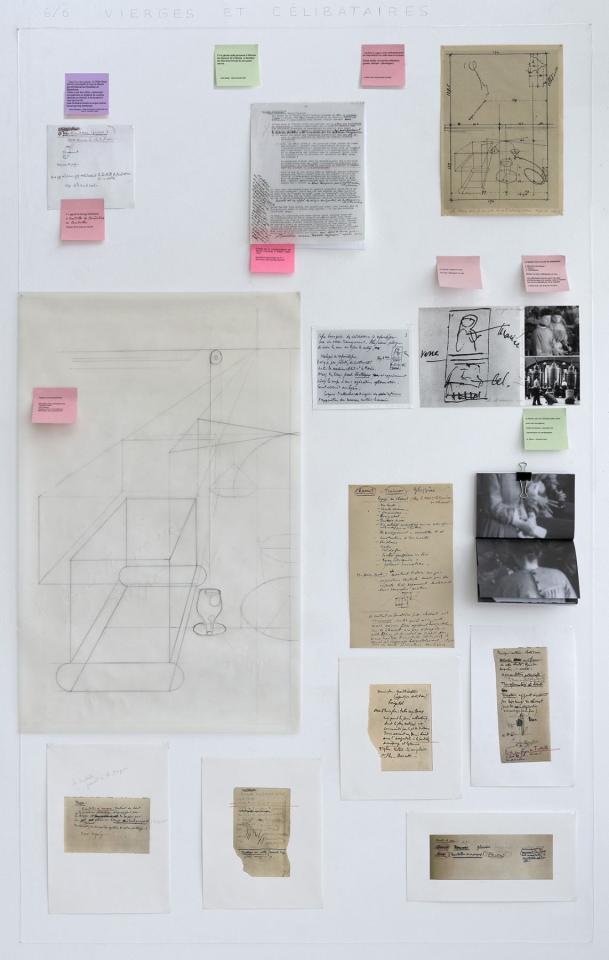 Marcel Duchamp et la bouteille de Bénédictine, détail de la section 6 Vierges et Célibataires, installation murale, 160 x 100 cm, notes, photos, post-it, imprimés, dessins, œuvres en volume