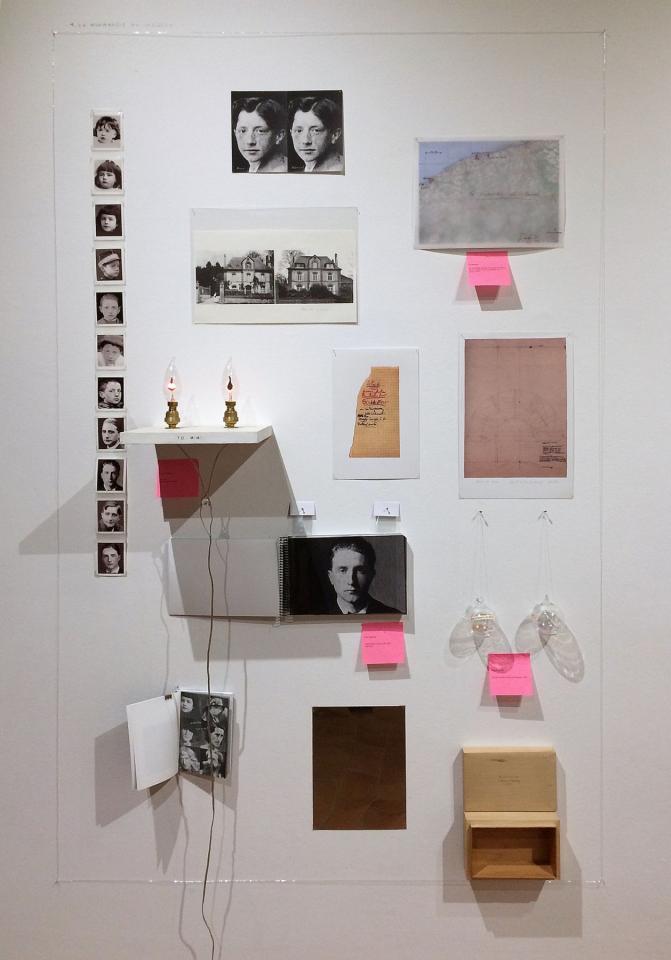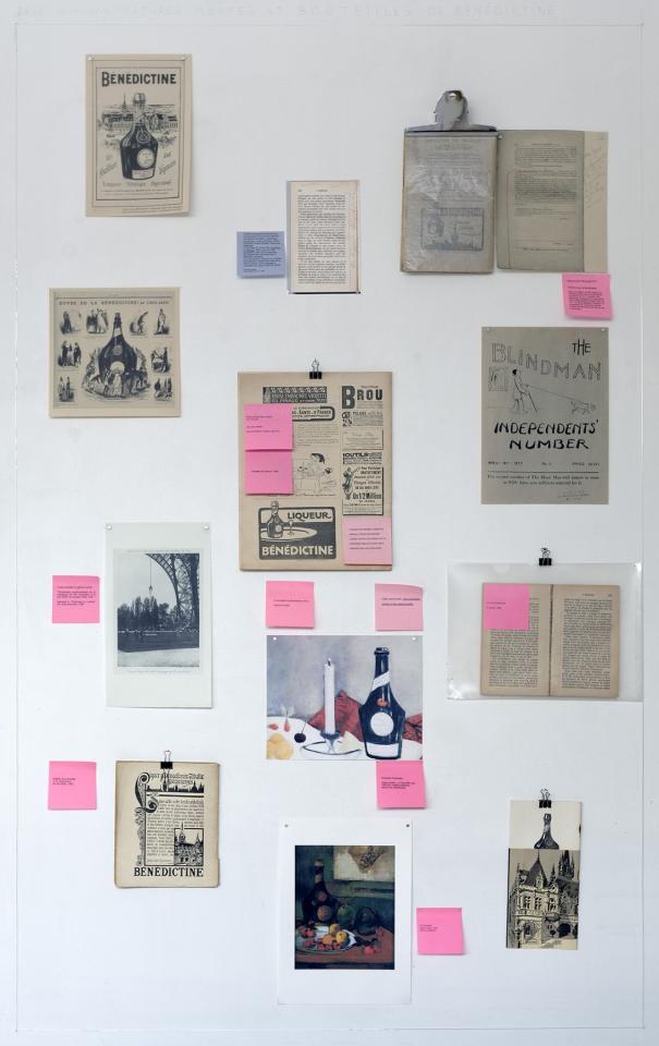 Marcel Duchamp et la bouteille de Bénédictine, détail de la section 2 Les Nature mortes, installation murale, 160 x 100 cm, notes, photos, post-it, imprimés, dessins, œuvres en volume
