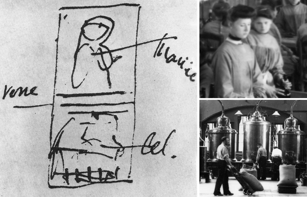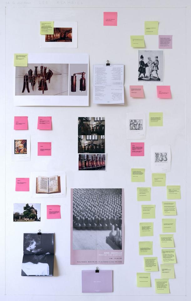 Marcel Duchamp et la bouteille de Bénédictine, détail de la section 3 Les Alambics, installation murale, 160 x 100 cm, notes, photos, post-it, imprimés, dessins, œuvres en volume
