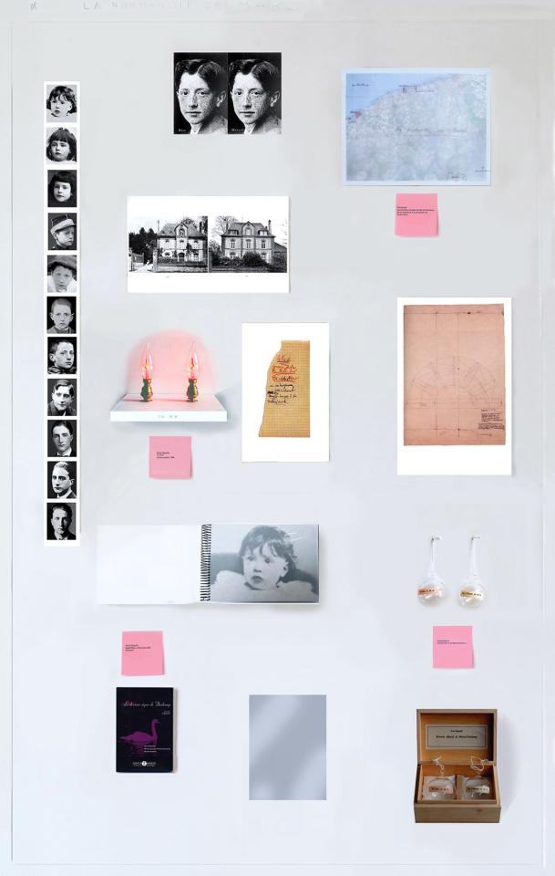 Marcel Duchamp et la bouteille de Bénédictine, détail de la section 1 La Normandie de Marcel, 2001, installation murale, 160 x 100 cm, notes, photos, post-it, imprimés, dessins, œuvres en volume