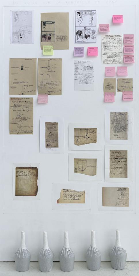 Marcel Duchamp et la bouteille de Bénédictine, détail de la section 5 Notes de MD sur la bouteille de Béné, installation murale, 160 x 100 cm, notes, photos, post-it, imprimés, dessins, œuvres en volume