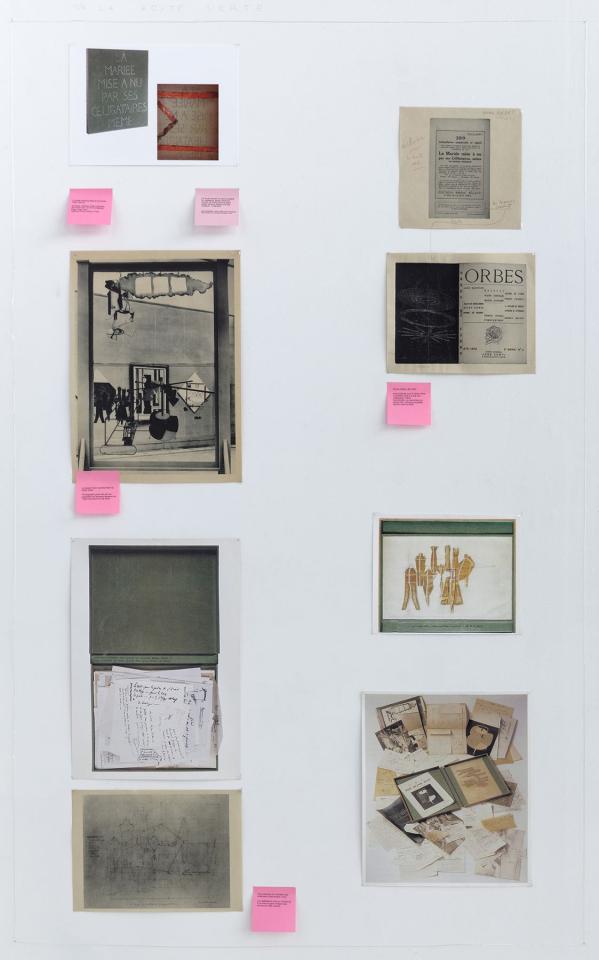 Marcel Duchamp et la bouteille de Bénédictine, détail de la section 4 La Boîte Verte, installation murale, 160 x 100 cm, notes, photos, post-it, imprimés, dessins, œuvres en volume