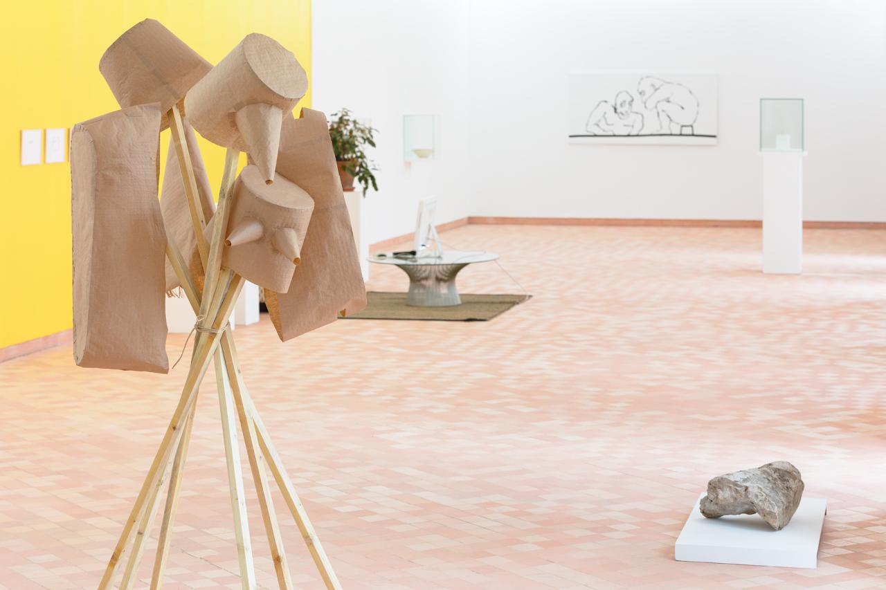 Brown paper bags, 2018, brioche, sheepskin, sandstone, skin glue, chalk, exhibition view Los Amigos, MAGCP centre d’art contemporain, Cajarc, France, 2018, photo Yohann Gozard