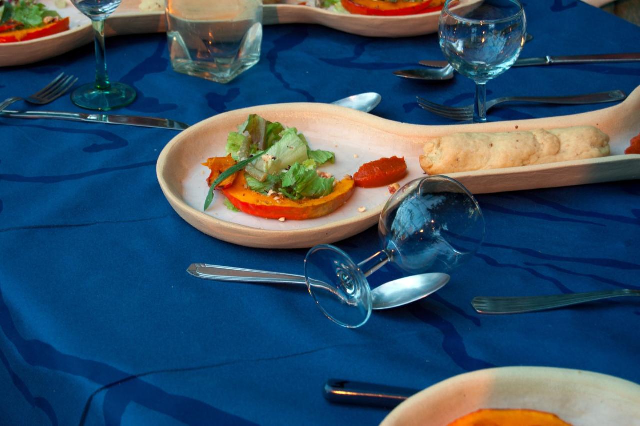 Courant Sagittal, 2018, performance, 30 enameled stoneware plates, 25 meters printed tablecloth, Centre d’art et de Design, Nègrepelisse, France, 2018