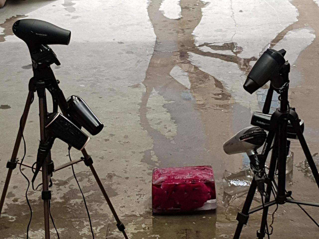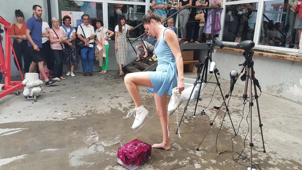 This performance is the result of research I conducted on frozen dresses as traces of past performances. These ephemeral sculptures are activated during performances, such as this one, in which I attempt to free two garments from their icy shell so that I can put them on. Here, the title suggests that the process of freeing the two dresses was not entirely successful.