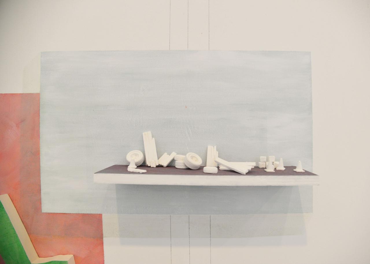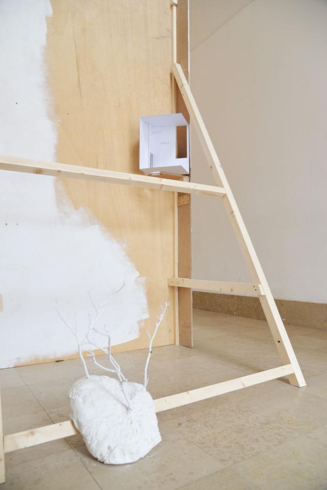 Michael Lilin, Je cherche encore, 2019, plâtre et bois; Florence Bazin, Florence Bazin, MC - 15 - 15 - 03, 2019, carton duo, dimensions variables, détail