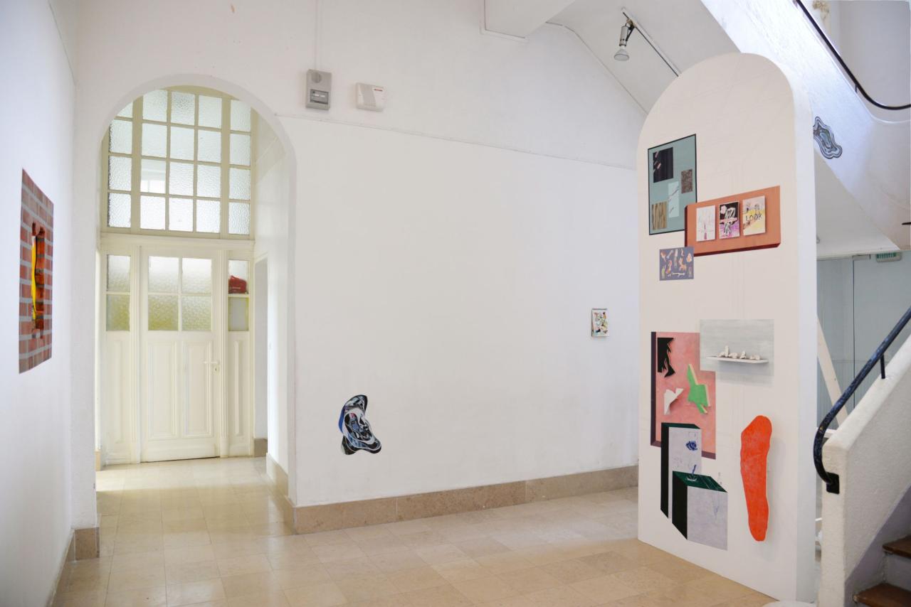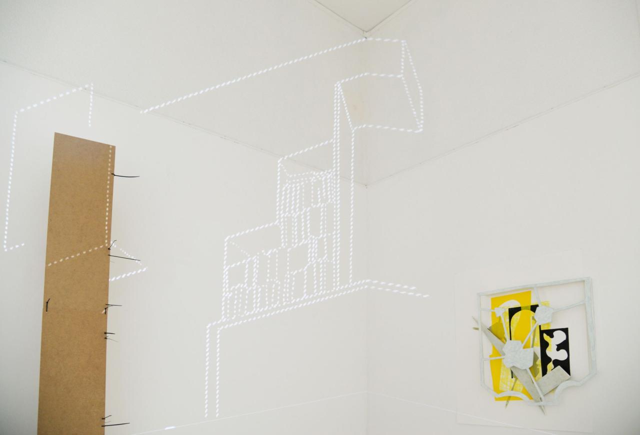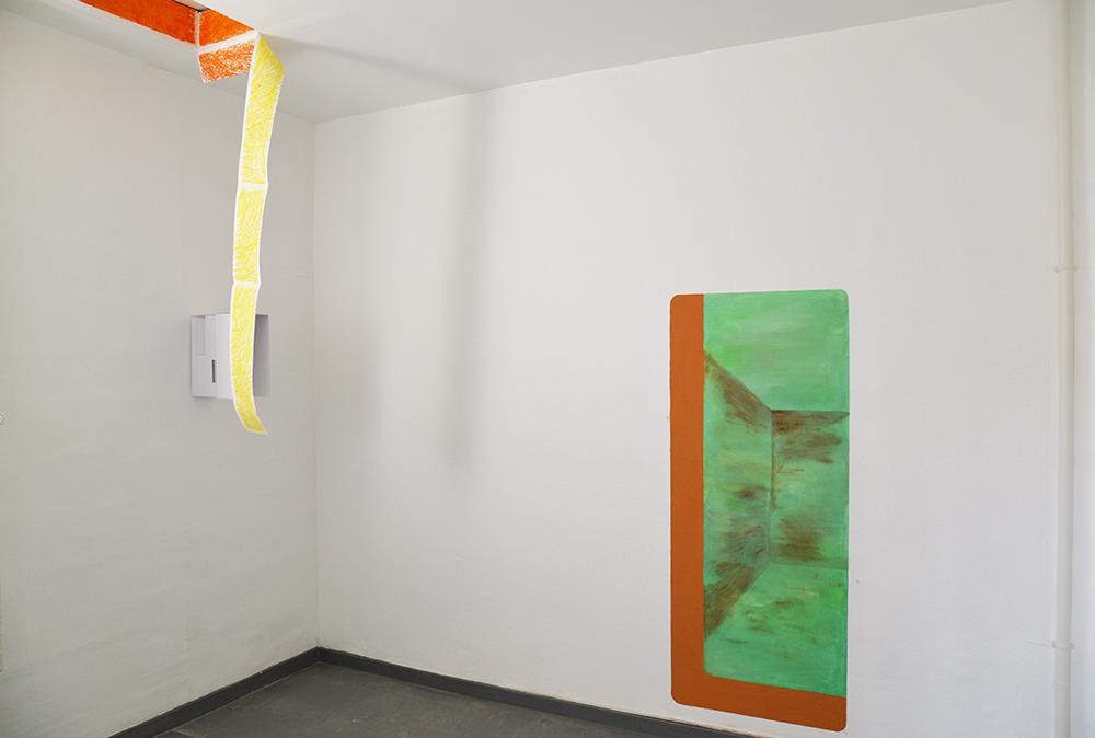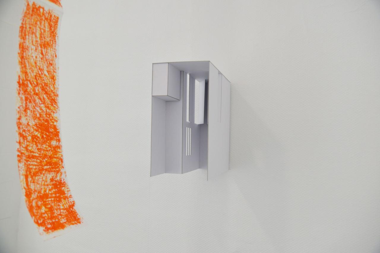 de gauche à droite : David Gommez, Sans titre 1, 2019, encre et crayon sur papier; Florence Bazin, MC - 15 - 15 - 02, 2019, carton duo, dimensions variables; Rébecca Konforti, intervention d’Emmanuel Simon, Espace pictural, espace commun #6, 2019, peinture murale à l’aquarelle, 170 x 60 cm