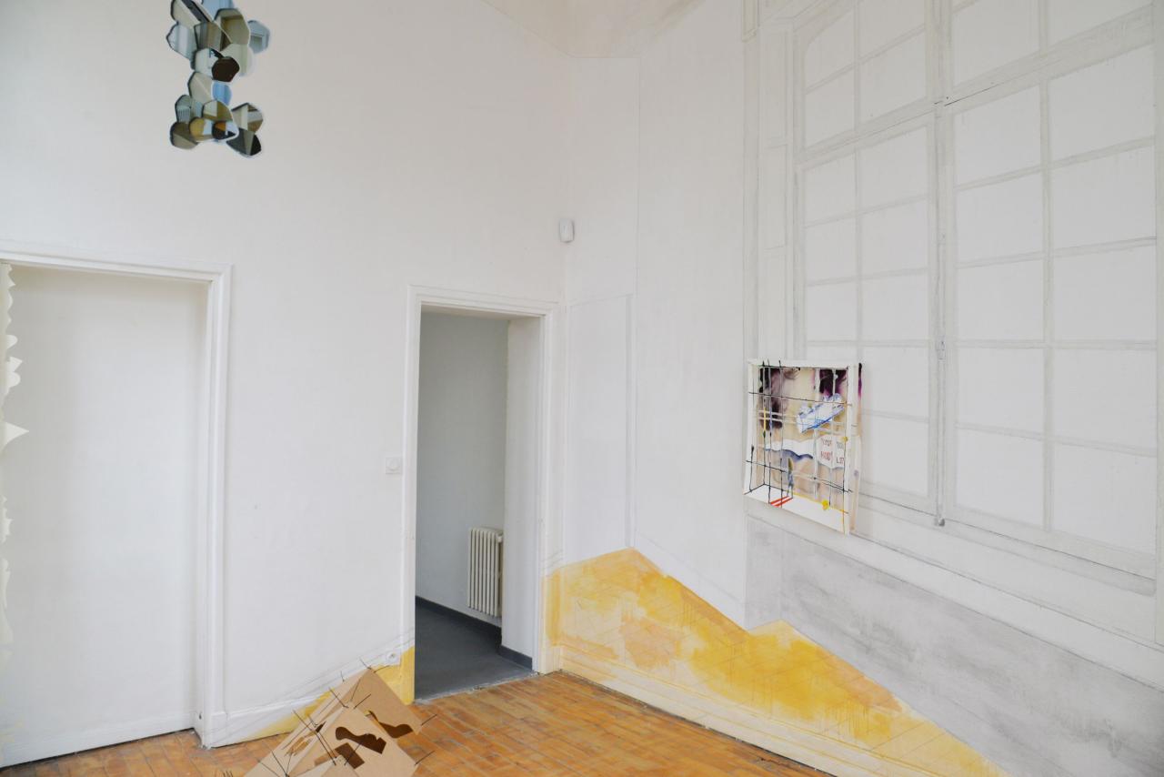 de gauche à droite: Emmanuel Simon, (H)all over 17 - Archipel #2, 2019, pigments et eau, 420 x 1500 cm; Florence Bazin, MC-15-15-01, 2019, carton duo, dimensions variables; Michael Lilin, Some elegant prank, 2019, encre et aquarelle sur papier, 60 x 45 x 5 cm; Galerie Rezeda, Coffrage 1, intervention de David Gommez, 2019, bois mdf, colliers de serrage, dimensions variables; David Leleu, Excavation, 2019, impression sur pvc adhésif, 15 x 10 cm
