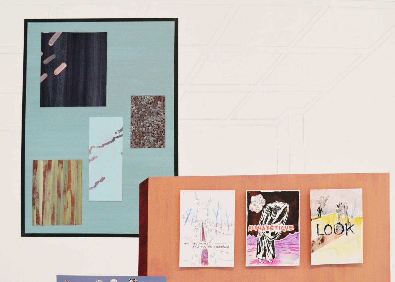 de gauche à droite : Sylvie Quillet, Regard brisé, 2019, peinture aérographe et encre, 80 x 90 cm; Rébecca Konforti, intervention d’Emmanuel Simon, Espace pictural, espace commun#6, 2019, texte imprimé sur papier machine A4; David Leleu, Excavation (cartons Hallover), 2019, impression sur pvc adhésif, 50 x 35 cm