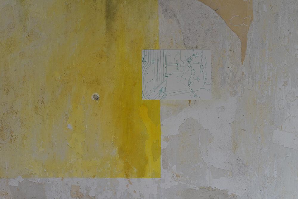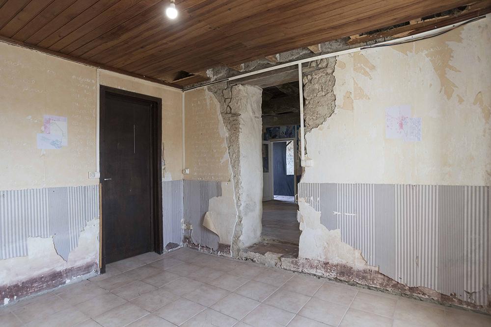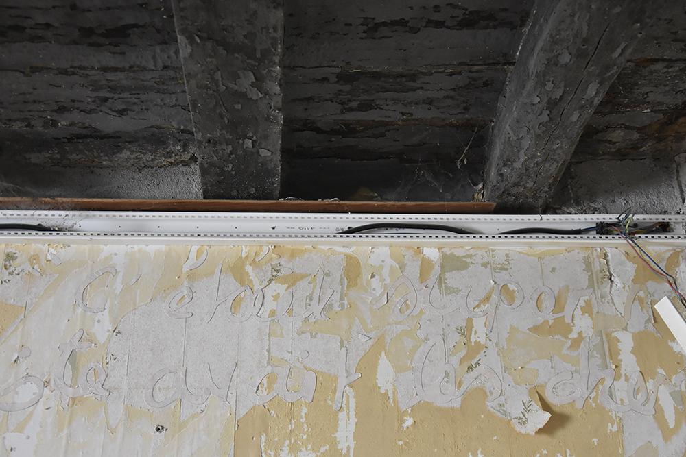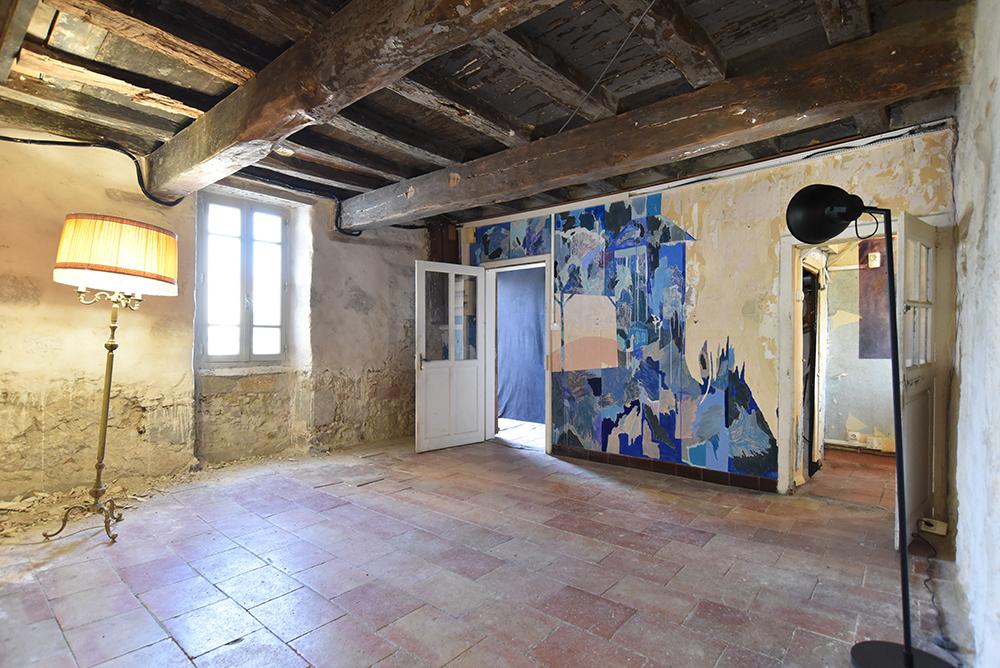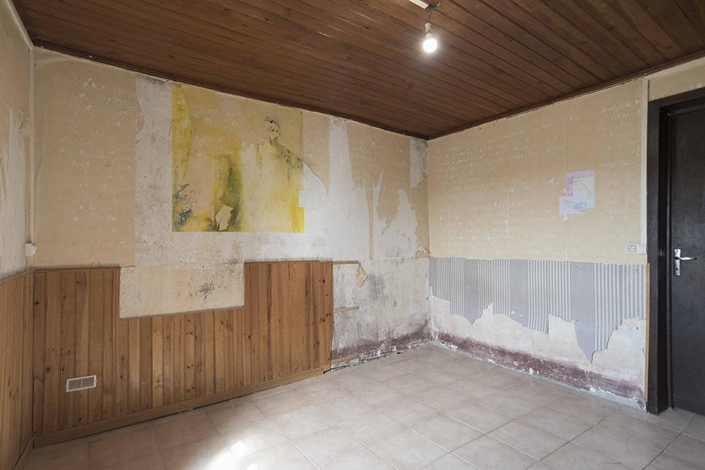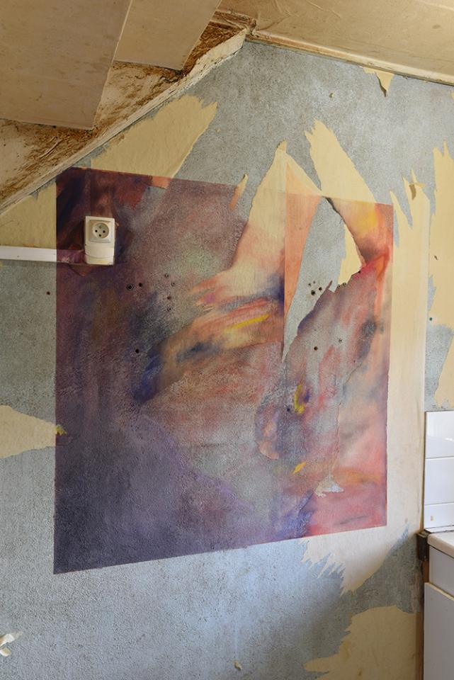 Mais surtout, ils furent la source d’un intense travail pictural à même les murs de la maison que leur hôte, Philippe, leur laissa libre de toute intervention. Pour « faire récit », les quatre protagonistes, aidés de stagiaires, purent ainsi peindre, gratter, encoller en embrassant de grandes surfaces murales.