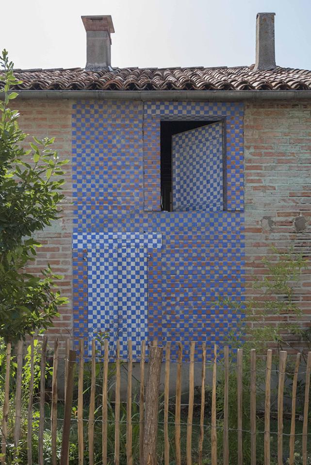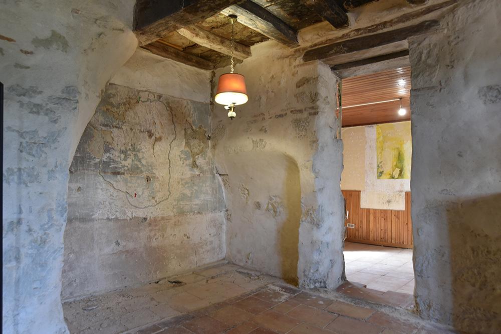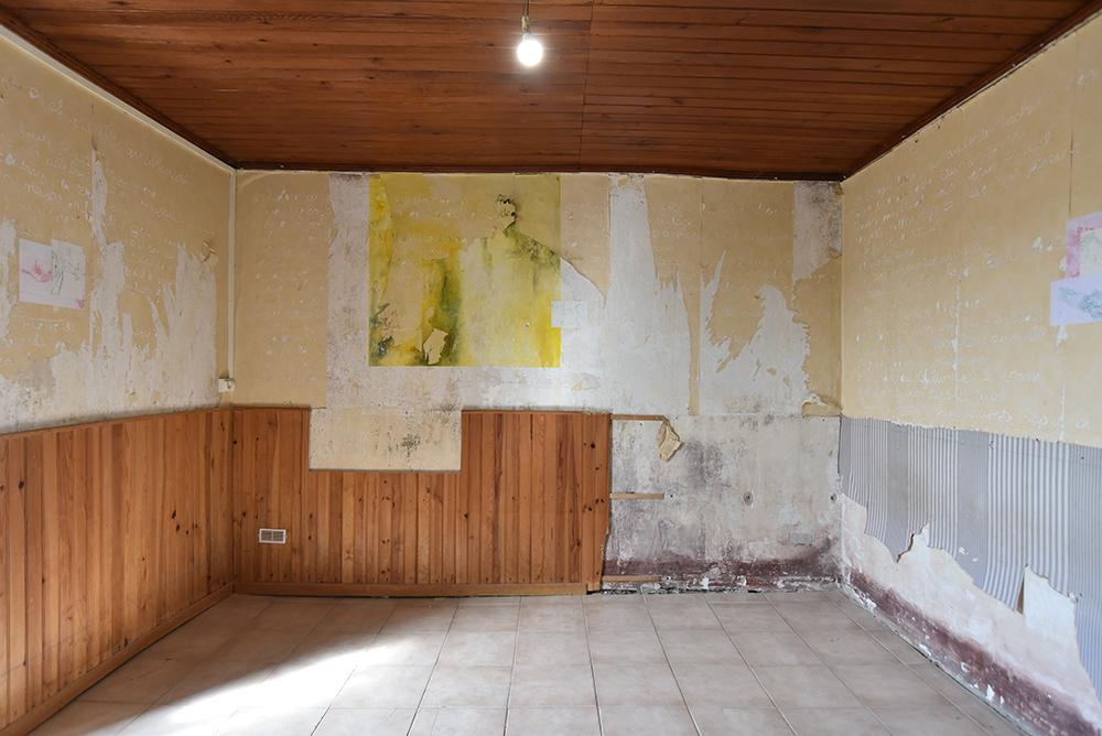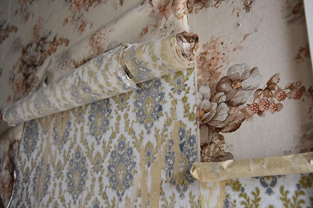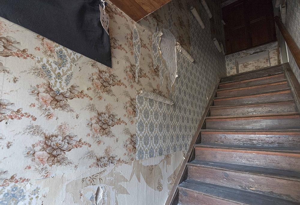 Mais surtout, ils furent la source d’un intense travail pictural à même les murs de la maison que leur hôte, Philippe, leur laissa libre de toute intervention. Pour « faire récit », les quatre protagonistes, aidés de stagiaires, purent ainsi peindre, gratter, encoller en embrassant de grandes surfaces murales.