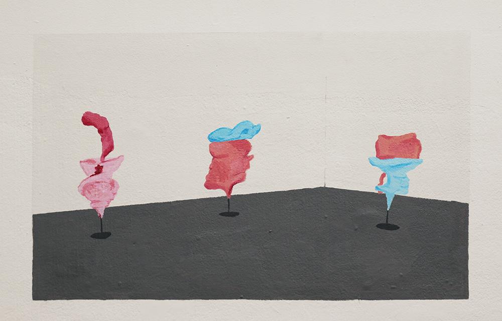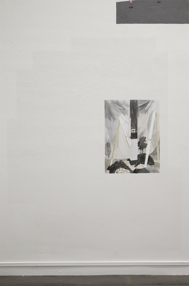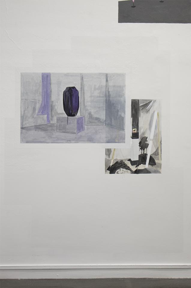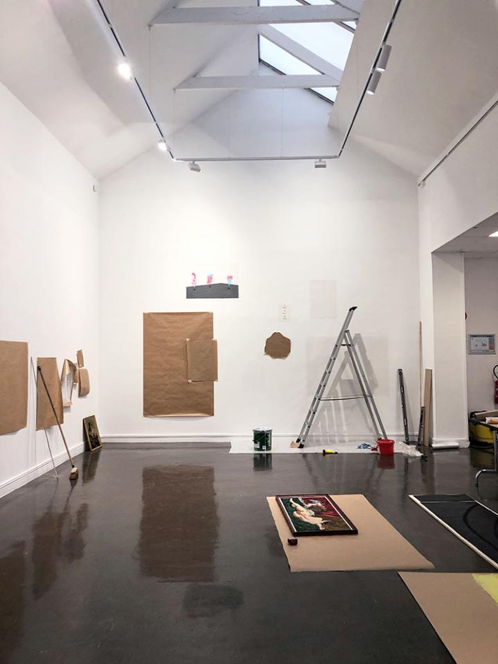 Marion Lebbe, Mur d’oeuvres modèles, 2019, pigments, eau, acrylique, stylo bic, gouache, vue de l’exposition mayonnaise au Centre d’Arts Plastiques et Visuels de Lille