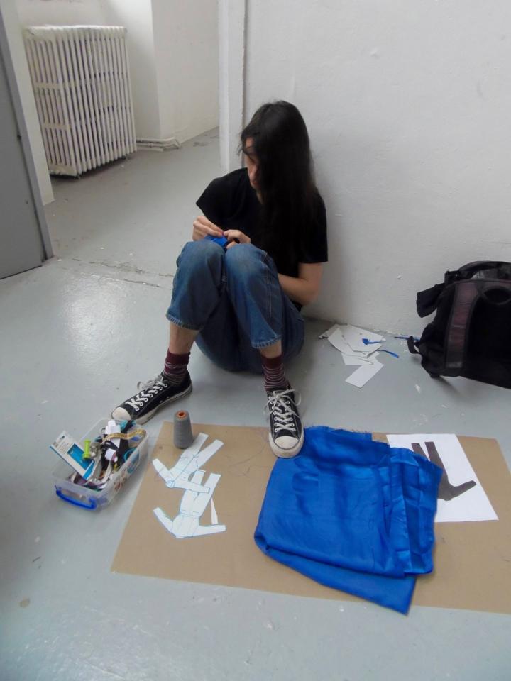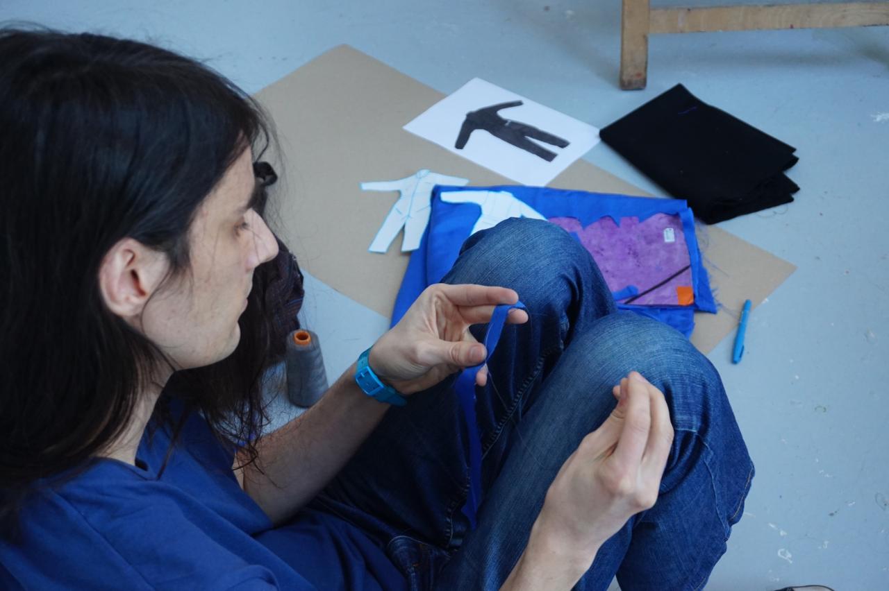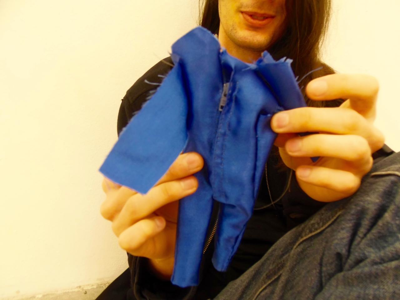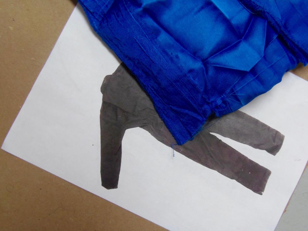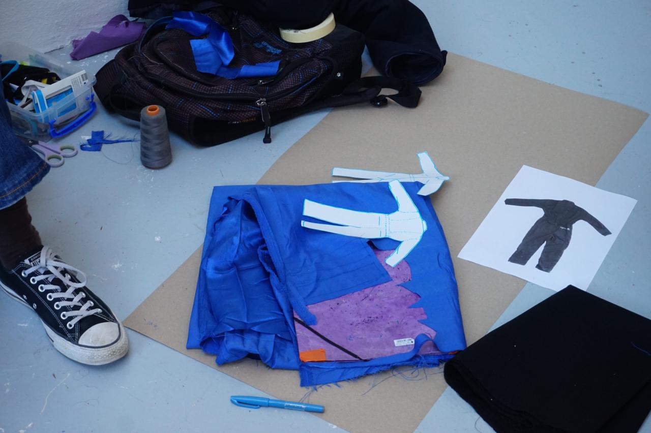 Le tissus brillant et neuf a intéressé George qui réalise un petit costume à partir du bleu de travail amené par Thibault. Il transforme l’histoire de petite fille en histoire de petit garçon.