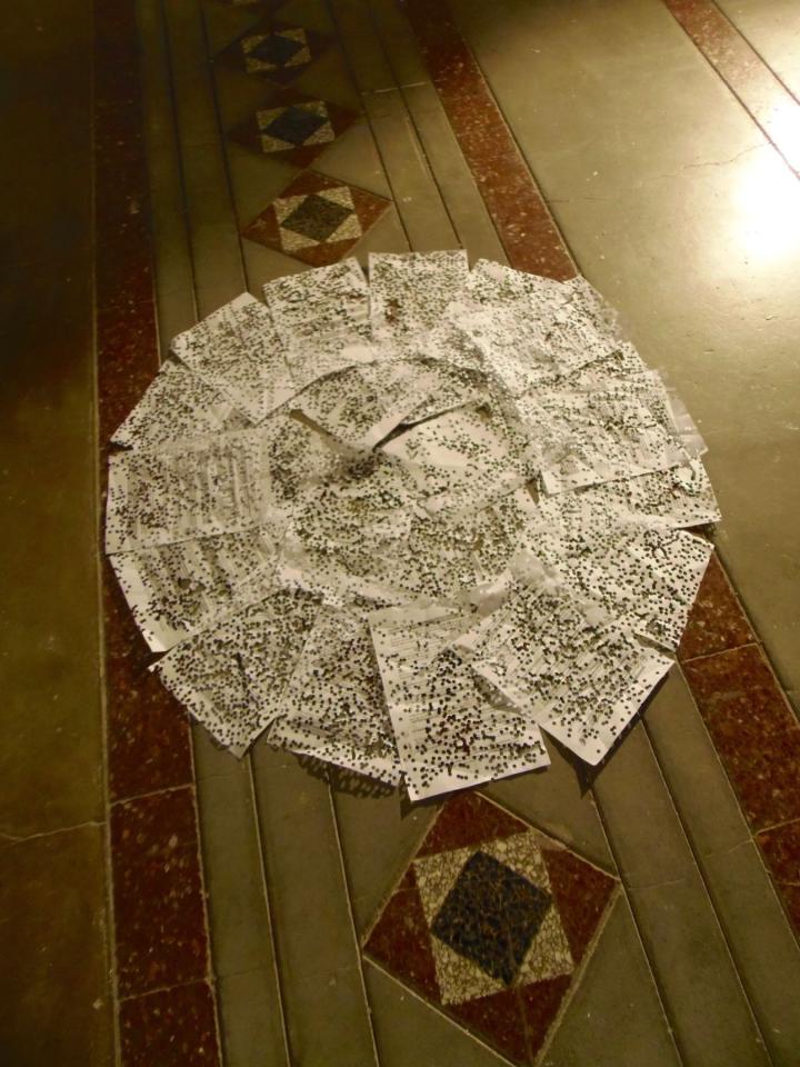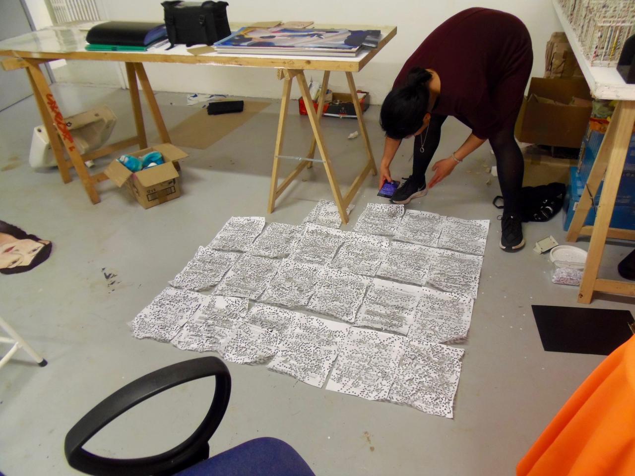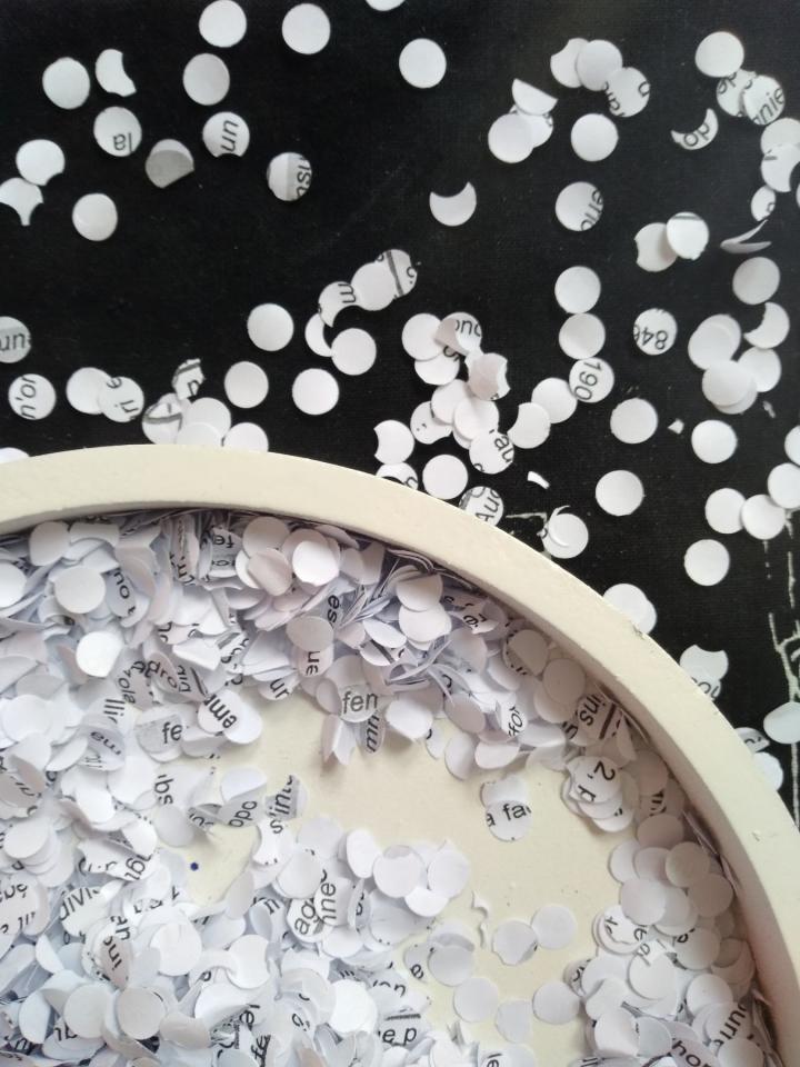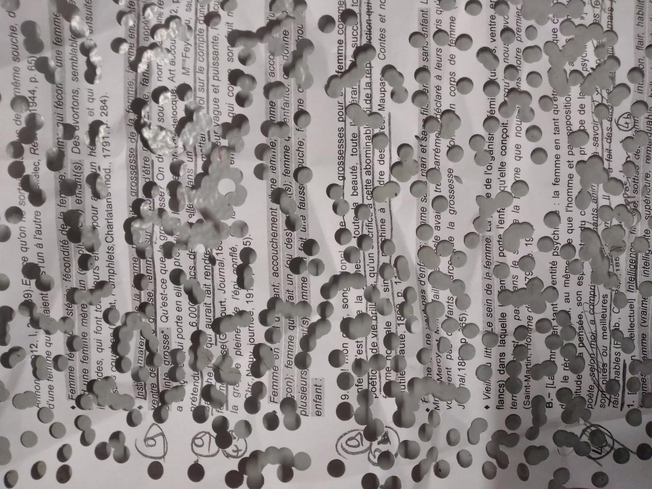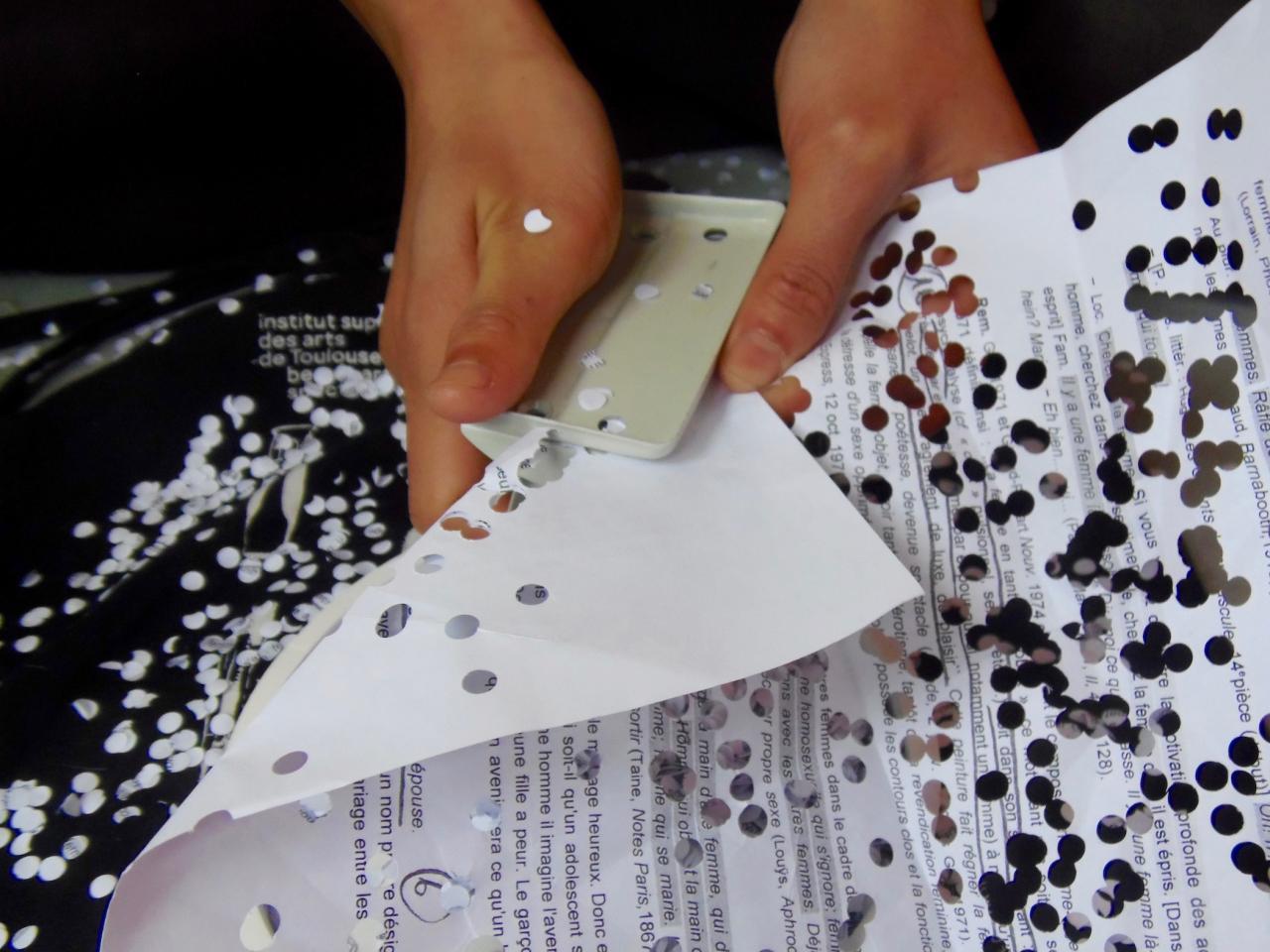 Socheata a perforé le texte à l’infini créant ainsi de nombreux confettis.