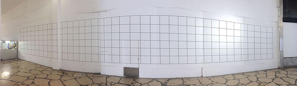Wo genau ? Die Wand, an der wir arbeiten, ist durch ein Raster gegliedert, dass wir auf die Wand gezeichnet haben. Die Raster-Einheiten entsprechen 50cm. Um zu bestimmen wo deine Arbeit platziert wird definiere bitte mit Hilfe des beiliegenden PDF’s eine Koordinate (Buchstabe +Zahl) auf dem beiliegenden Raster. Wir beginnen mit der Tapezierung deines Bildes in der oberen rechten Ecke des von dir gewählten Koordinatenfeldes.