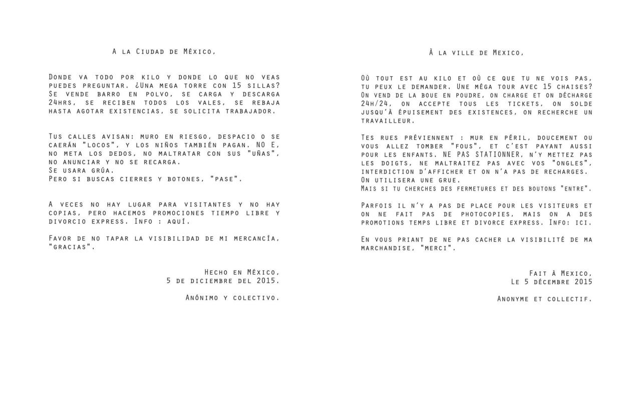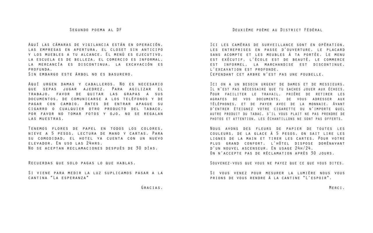 Hecho en México résulte aussi d’un travail de rencontre, de découpe et de déroute. L’artiste rêve une sociologie pour restituer un nouveau langage qui mixe traduction littérale et interprétation. A partir de la collecte de mots écrits et d’annonces dans les rues et places de Mexico, elle met en tension et en lien des fragments plus ou moins aléatoires pour composer des textes, lettres ou poèmes, anonymes et collectifs. La superposition des langues, des filtres de lecture et la dé-contextualisation des mots créent un ensemble étrange. Se mêlent sans hiérarchie, réalité sociale et environnement sous contrôle, désillusion et espoir, absurdité et humanité, intimité et espace public, une densité à plusieurs visages à l’image de la mégapole surpeuplée.