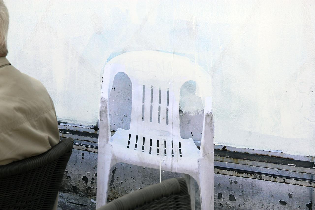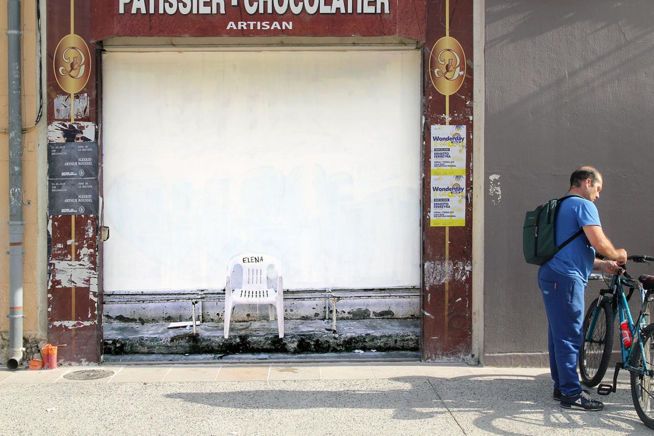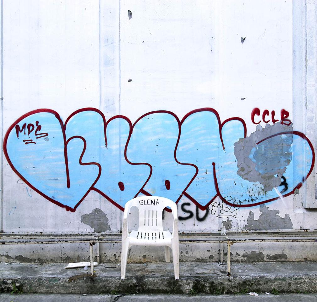 We see a wobbly chair which, far from those found on film sets, is nevertheless inscribed with the name of its user, signifying Elena’s place - in a neighbourhood of Mexico City - and the place that everyone carves out for themselves wherever they can.