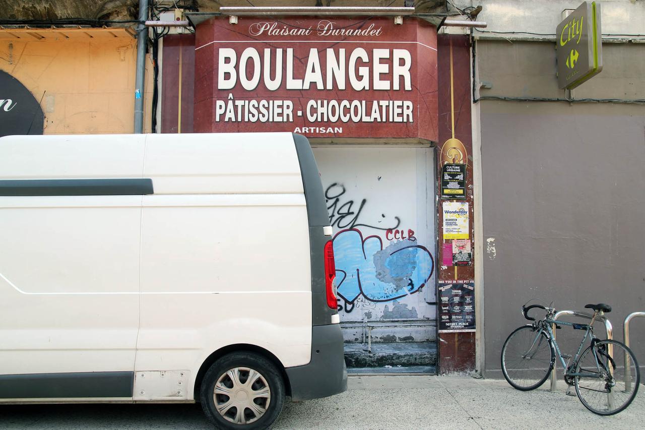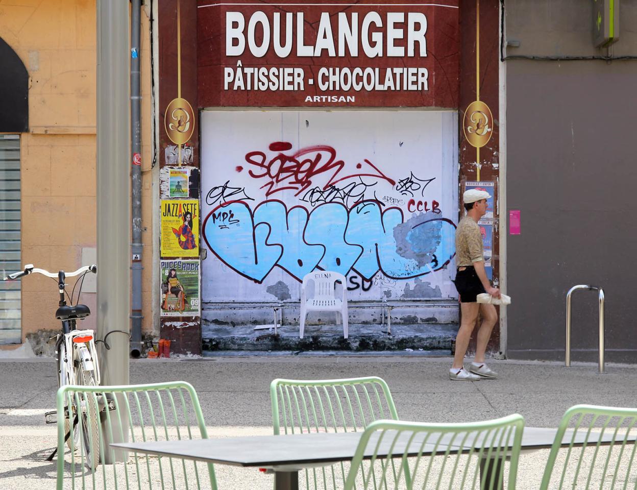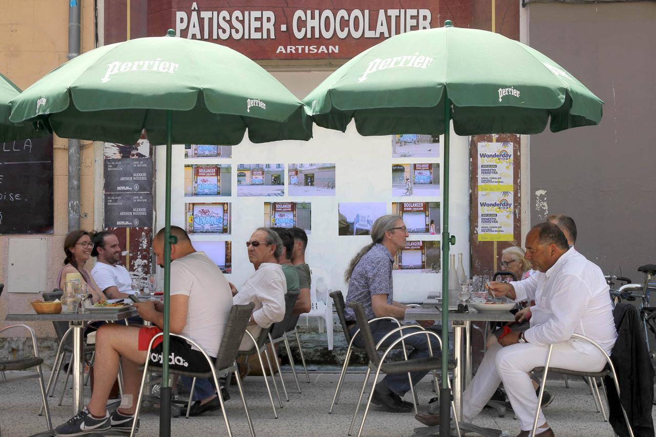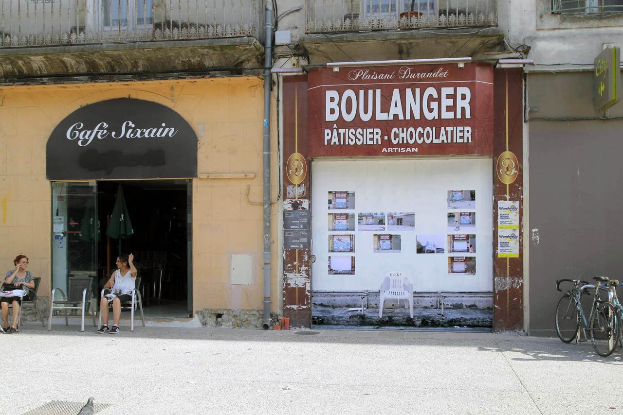 An abandoned sign, posters stuck on and peeled off, the menu of the day and its extendable terrace, the precarious occupation of the Carrefour entrance, a construction site still in progress and other elements make up the environment in which a borrowed image is placed.