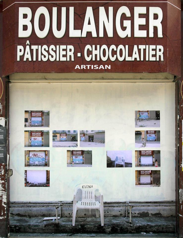 This installation went through various stages during its exhibition in public space. Graffiti was added to that already present in the photograph, some in the same colour, amplifying the trompe l’oeil effect of the scene reproduced on a scale of 1:1. On the day of the official inauguration in the square, the image appeared ‘cleaned up’, with the real or photographed graffiti covered with white paint. The municipal wall cleaning service left only the chair visible, on which I re-inscribed Elena’s missing name. The photographic documentation I produced each day was pasted in the form of A3 posters on the whitewashed wall of the image. Finally, the original photograph was reinstalled in its place and, little by little, new graffiti appeared above the subject.