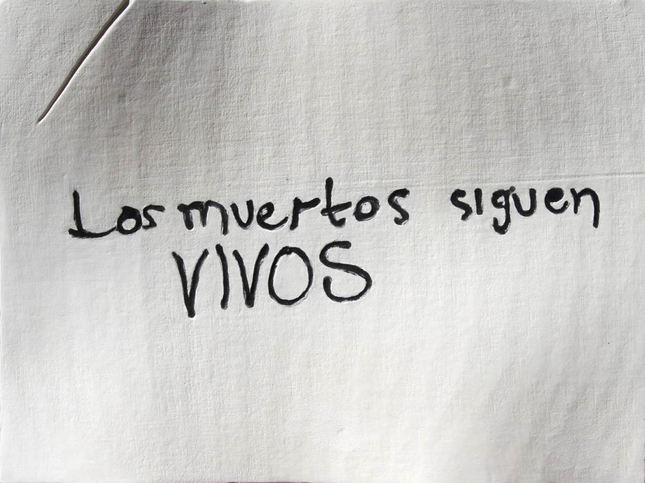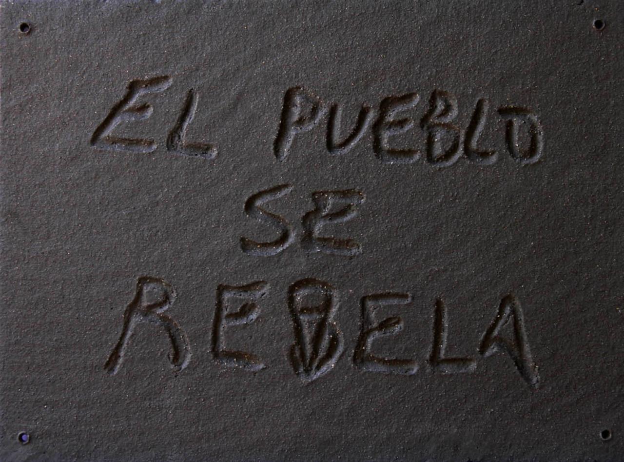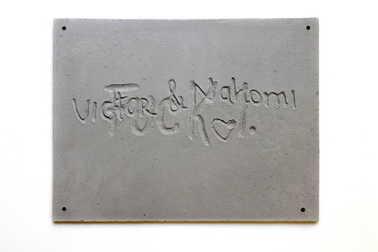 Dans l’idée de réaliser des plaques commémoratives dédiées non pas à des faits ou à des personnalités notables, mais à des inscriptions furtives, l’ensemble intitulé Lápidas (initié en 2019 dans le cadre d’une formation à Artelinea) consiste en une série de plaques de céramique sur lesquelles sont reproduits des graffitis photographiés dans la ville de Mexico. À ces graffitis s’est ajouté le symbole de l’étoile à 5 branches, observé sur de nombreuses tombes du cimetière de Decazeville. Les plaques obtenues présentent des irrégularités propres au modelage et à la plasticité mouvante de la terre. Certaines ont été partiellement émaillées dans une couleur qui contraste avec celle du fond. Leur forme peut parfois se rapprocher de celle d’un drapeau ou évoquer une pierre funéraire. Ainsi, le titre Lápidas fait référence aux pierres ou plaques funéraires, mais évoque aussi le style lapidaire des formules reproduites - qui sont parfois liés à des épisodes mexicains, mais qui restent suffisamment simples (facilement traduisibles en français) et indéterminées pour avoir un sens (peut-être un peu perturbé) chez nous aussi. Par exemple dans l’inscription « El pueblo se reb(v)ela » qui a initié ce projet, le doute orthographique provenant du fait que la lettre b et la lettre v se prononcent pareil en espagnol, et le repenti de leur superposition, permet de faire vibrer le sens de la phrase : « Le peuple se révèle / le peuple se rebelle ». Lors de l’exposition Telle est l’étoffe dont les rêves sont faits à la galerie AL/MA (Montpellier), la plaque Victor & Nahomi, faïence grise rappelant la texture d’un mur ou du béton, a été installée à une hauteur qui évoque la plaque de nom de rue, et la surimpression d’un mot rageur sur l’inscription antérieure ouvre encore les possibilités d’interprétation de la situation.