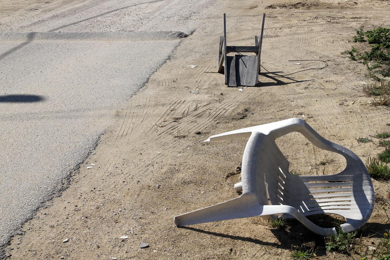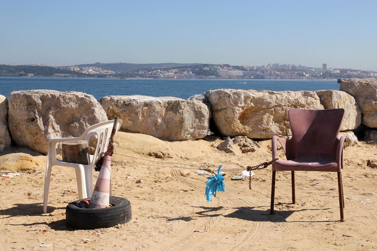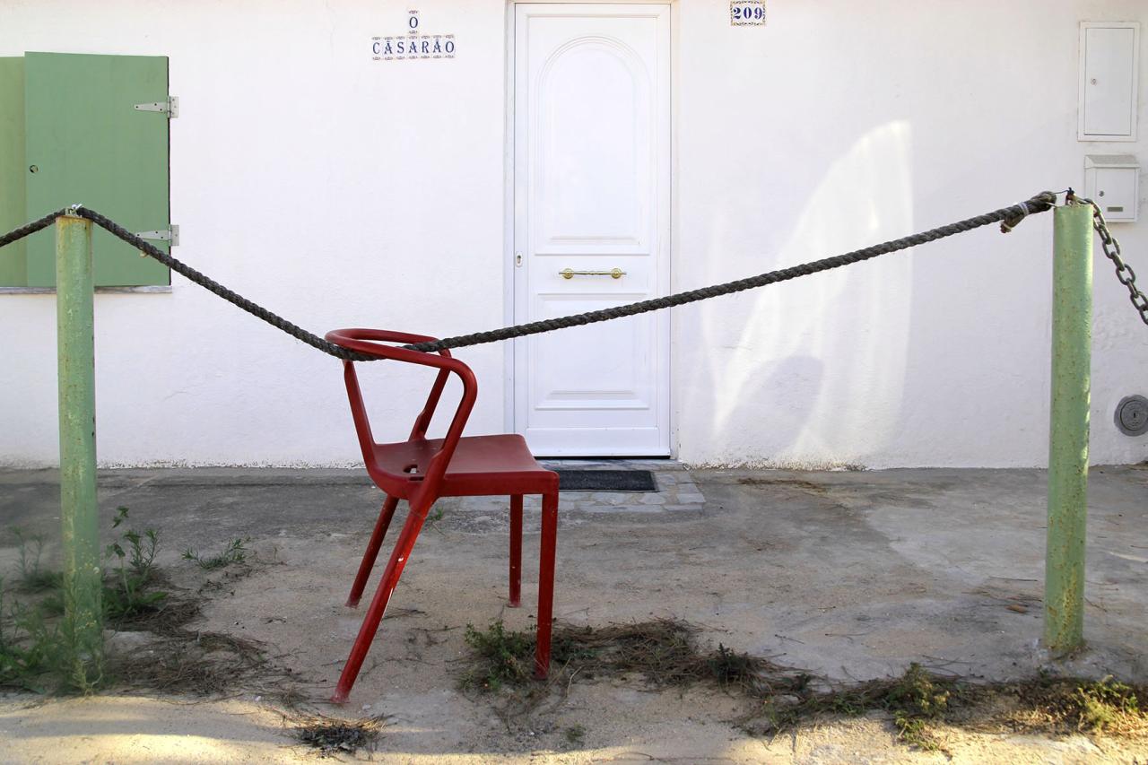 This series of photographs focuses on chairs in public spaces, from Cova do Vapor (a self-built micro-fishing village located on the point where the Tagus meets the Atlantic Ocean) to certain areas of Lisbon (working-class neighborhoods in the hills of Belem and Ayuda). From Cova to Trafaria (the embarkation point for crossing the Tagus), between the water’s edge and the main road, lies a vague area of makeshift camps and precarious dwellings (Torrão 2 and São Pedro de Trafaria). Along this route, in the images I have taken, these situations involving chairs affirm an idea: taking one’s place somewhere in a world that does not provide one with one, where one can and as one can, but in a precarious yet resilient way. Beyond signifying the occupation of a personal place in public space, there is the collective act of taking one’s place by means of improvised housing. Whether it be with houses built on top of each other in an area reduced by the advance of water, and initially without rights, by the fishermen of Cova themselves, with the slum of Torrão 2, between pine forest and illegal dump, with the precarious constructions of São Pedro de Trafaria, or with the occupation of disparate and rehabilitated housing in the upper districts of Belem, in Lisbon. Collecting these images of chairs is also a way of drawing, with this recurring motif, a whole that connects various places in a vague area and evokes a human presence in relation to a social environment and a landscape.