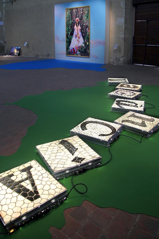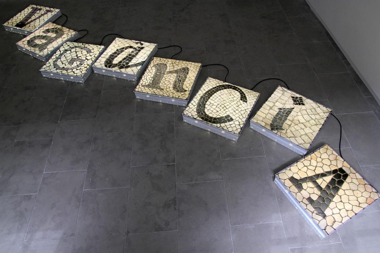 The resulting piece is a floor installation of a word, made up of prints of individually photographed letters. The letters are arranged in a 60 x 60 cm square format. The prints are backlit, placed on light boxes on the floor. I use recycled lighting tiles, materials that a school was getting rid of. The first three words that inspired the project, Vagância, Pavé, and Revolução, influence each other and suggest a connection between them, a meaning that seems to have evaporated from the city sidewalks.