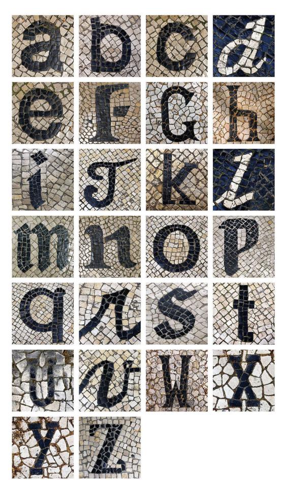 I photographed each letter individually from the signs inscribed on the ground (with black cobblestones among the white ones) in front of the entrance to the premises named as such (“Sociedade” is one example); all the letters, whether uppercase, lowercase, with or without accents, cedillas, or umlauts, as well as all the punctuation marks I could find during my wanderings around the city, in order to gather as many as possible to compose the most complete typographic set possible.
