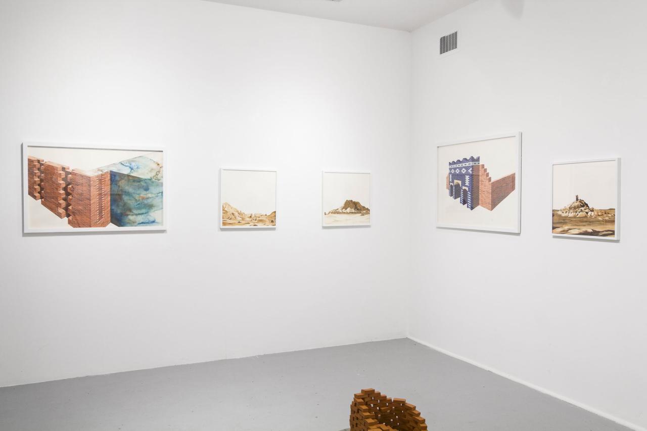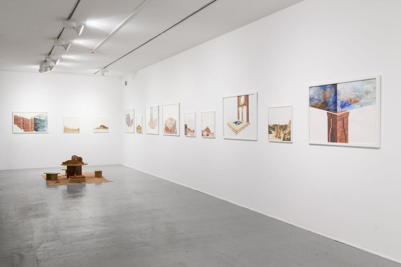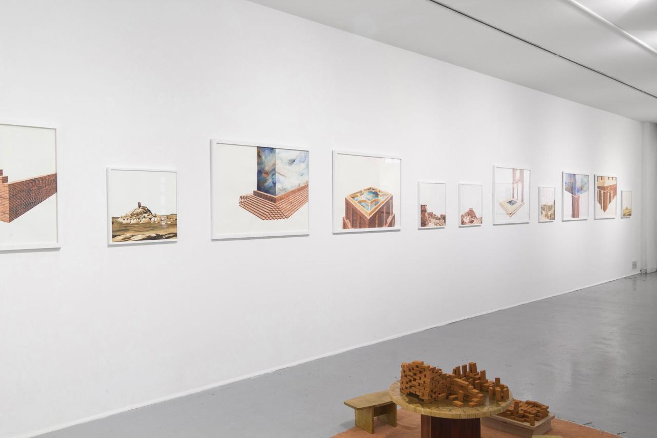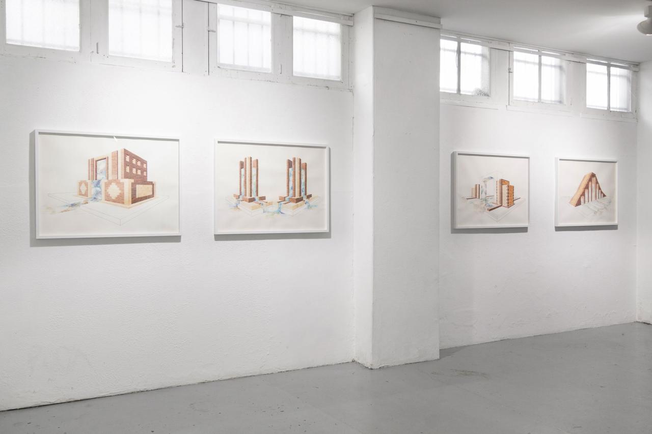 L’exposition propose une déambulation au travers de paysages et de bâtiments fragmentés, pouvant suggérer qu’il s’agit d’un lieu appréhendé selon différents angles et dont la vue d’ensemble, par son absence, est laissée à notre imagination. L’univers se déploie en un ensemble d’aquarelles (médium privilégié de l’observation), où la solidité des murs de briques vacille dans l’espace blanc de la feuille, se perd dans le hors-champ, s’étiole, émerge, et se liquéfie finalement. Le tracé suggère l’inachevé, un mouvement perpétuel oscillant entre construction et effondrement. Il présente une variété de strates, différents états de la matière. Tour à tour il affirme sa pesanteur, ses volumes, puis s’en vide.