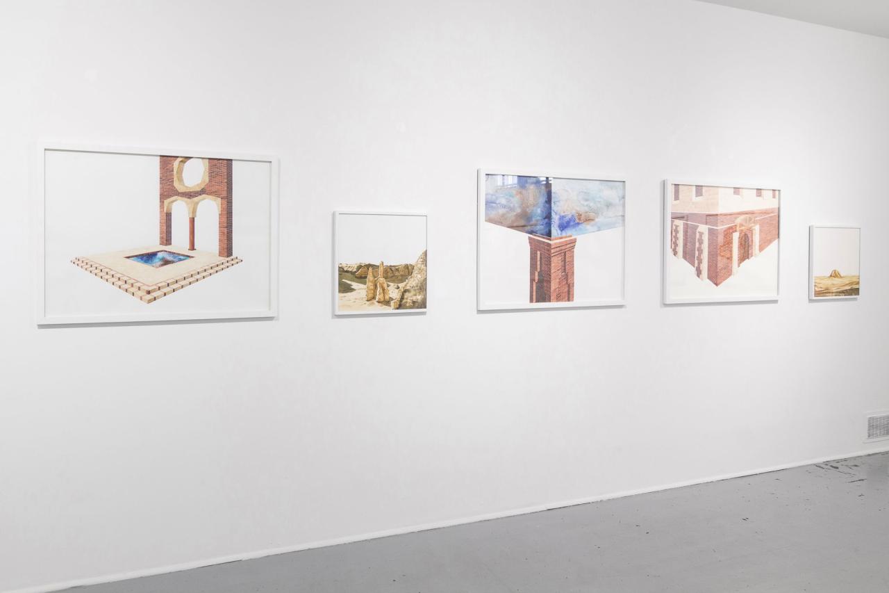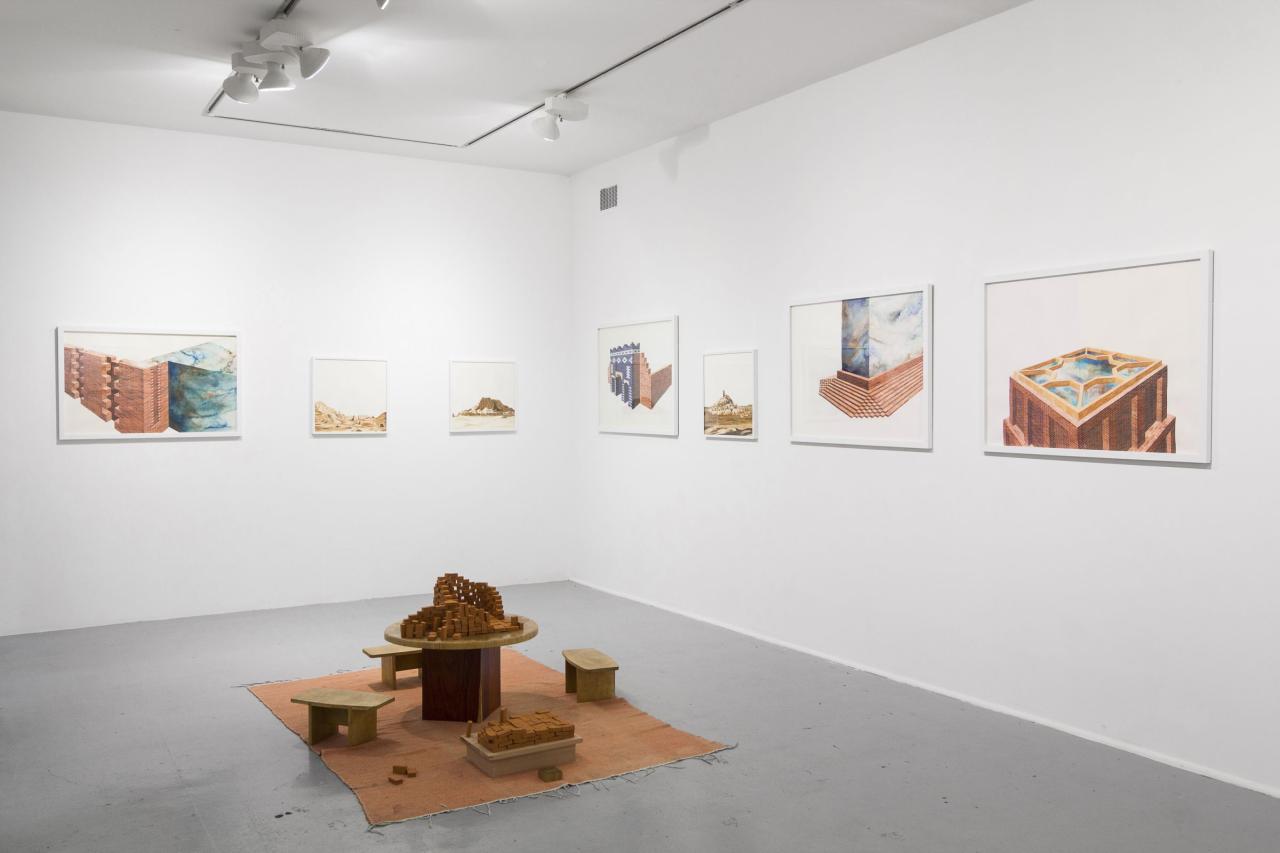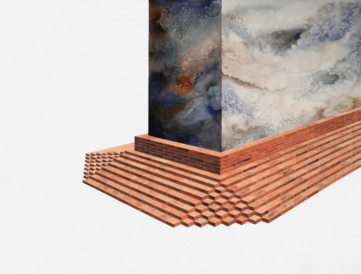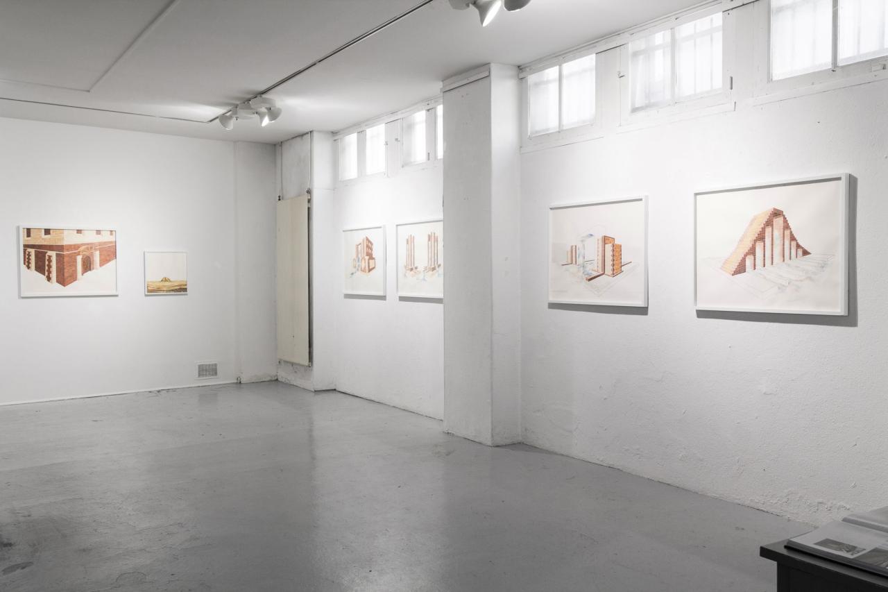 L’exposition propose une déambulation au travers de paysages et de bâtiments fragmentés, pouvant suggérer qu’il s’agit d’un lieu appréhendé selon différents angles et dont la vue d’ensemble, par son absence, est laissée à notre imagination. L’univers se déploie en un ensemble d’aquarelles (médium privilégié de l’observation), où la solidité des murs de briques vacille dans l’espace blanc de la feuille, se perd dans le hors-champ, s’étiole, émerge, et se liquéfie finalement. Le tracé suggère l’inachevé, un mouvement perpétuel oscillant entre construction et effondrement. Il présente une variété de strates, différents états de la matière. Tour à tour il affirme sa pesanteur, ses volumes, puis s’en vide.