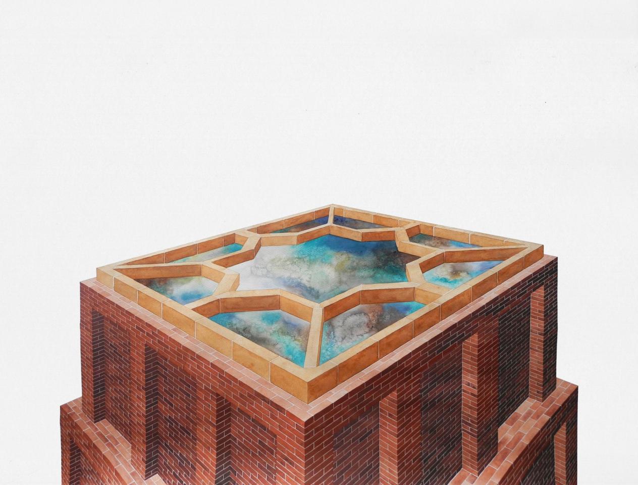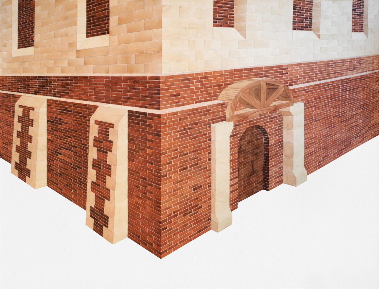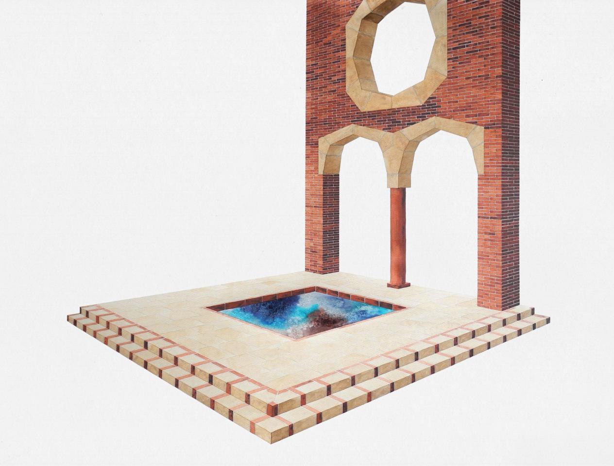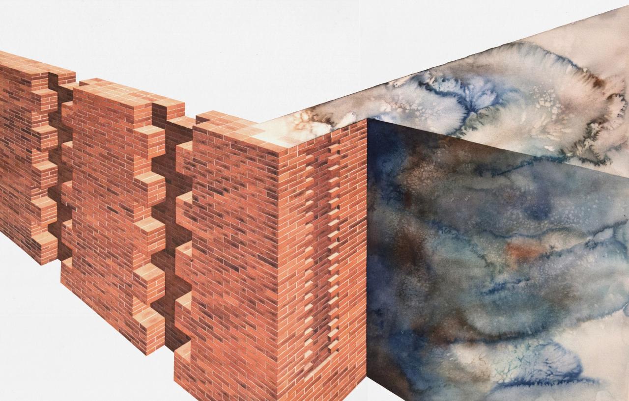 L’exposition propose une déambulation au travers de paysages et de bâtiments fragmentés, pouvant suggérer qu’il s’agit d’un lieu appréhendé selon différents angles et dont la vue d’ensemble, par son absence, est laissée à notre imagination. L’univers se déploie en un ensemble d’aquarelles (médium privilégié de l’observation), où la solidité des murs de briques vacille dans l’espace blanc de la feuille, se perd dans le hors-champ, s’étiole, émerge, et se liquéfie finalement. Le tracé suggère l’inachevé, un mouvement perpétuel oscillant entre construction et effondrement. Il présente une variété de strates, différents états de la matière. Tour à tour il affirme sa pesanteur, ses volumes, puis s’en vide.