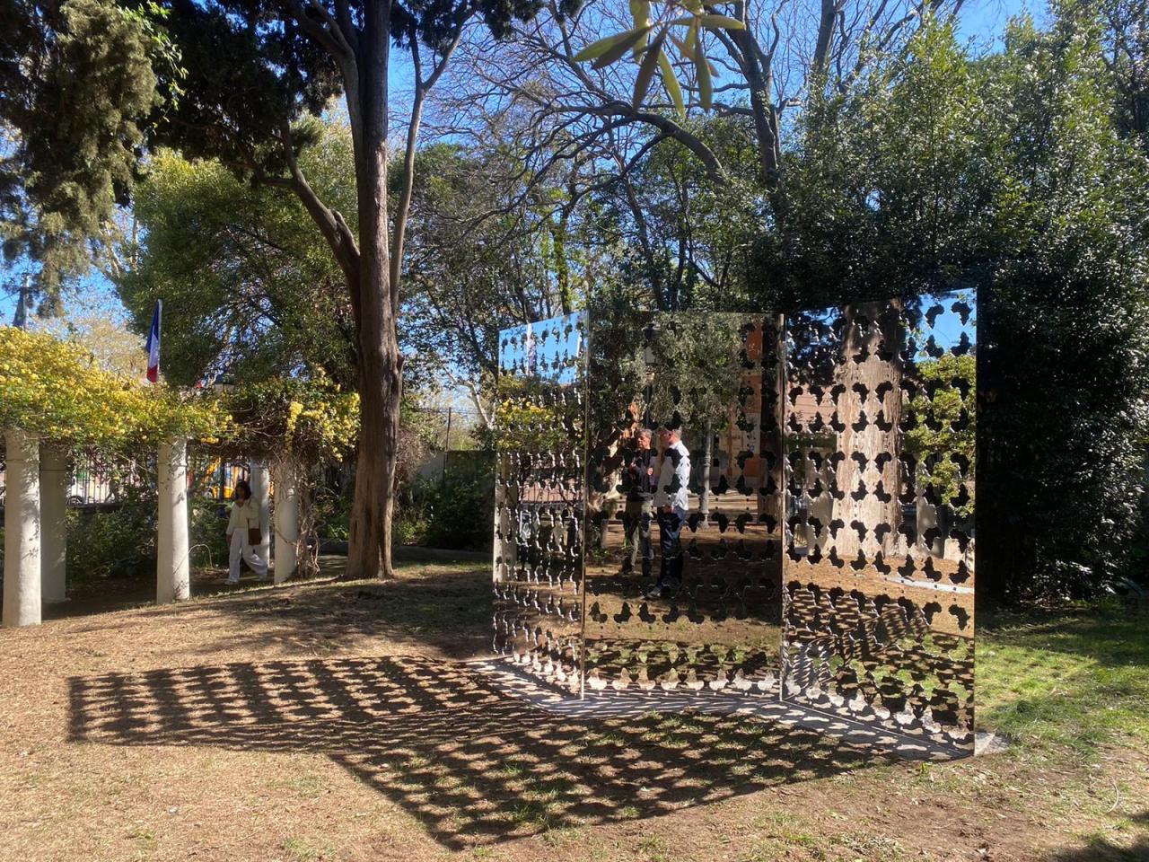 Afrique / France - France / Afrique, 2021, plaques d’inox poli miroir découpées, commande publique, parc Nelson Mandela, Montpellier
