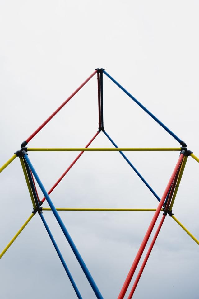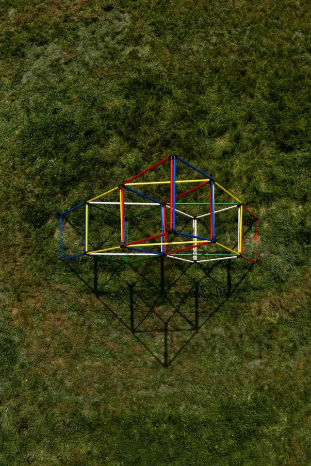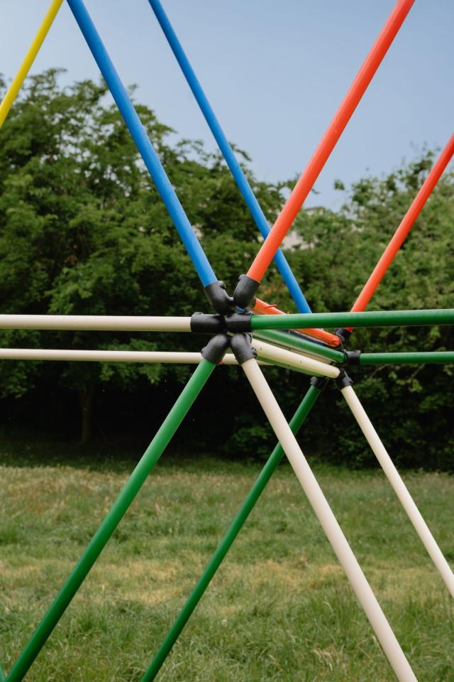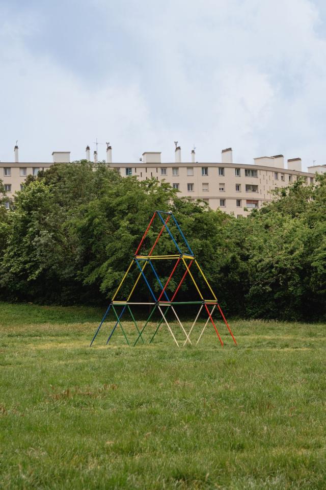 Apprendre à annoncer la couleur, 2025, house of cards, aluminium tubes and painting, 580 x 600 cm, photo Claudia Goletto