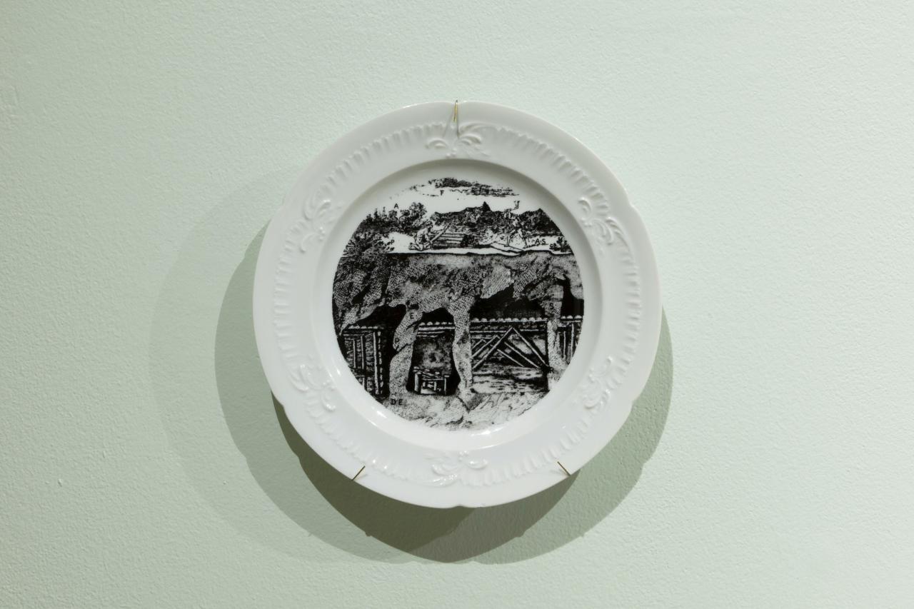 Les dessins tirés de l’ouvrage Arts des Mines, de l’Encyclopédie de Diderot et d’Alembert, sont agrandis, recadrés, reproduits point par point aux feutres fins et enfin sérigraphiés au fond de quatre assiettes. Ces même assiettes “parlantes”, parfois accrochées au murs des cuisines familiales. Ici, il y a des hommes, seuls ou en groupes, pliés par le travail d’extraction, dans un paysage façonné de leurs mains. Il y a des mots aussi, à reconstituer lettre à lettre.