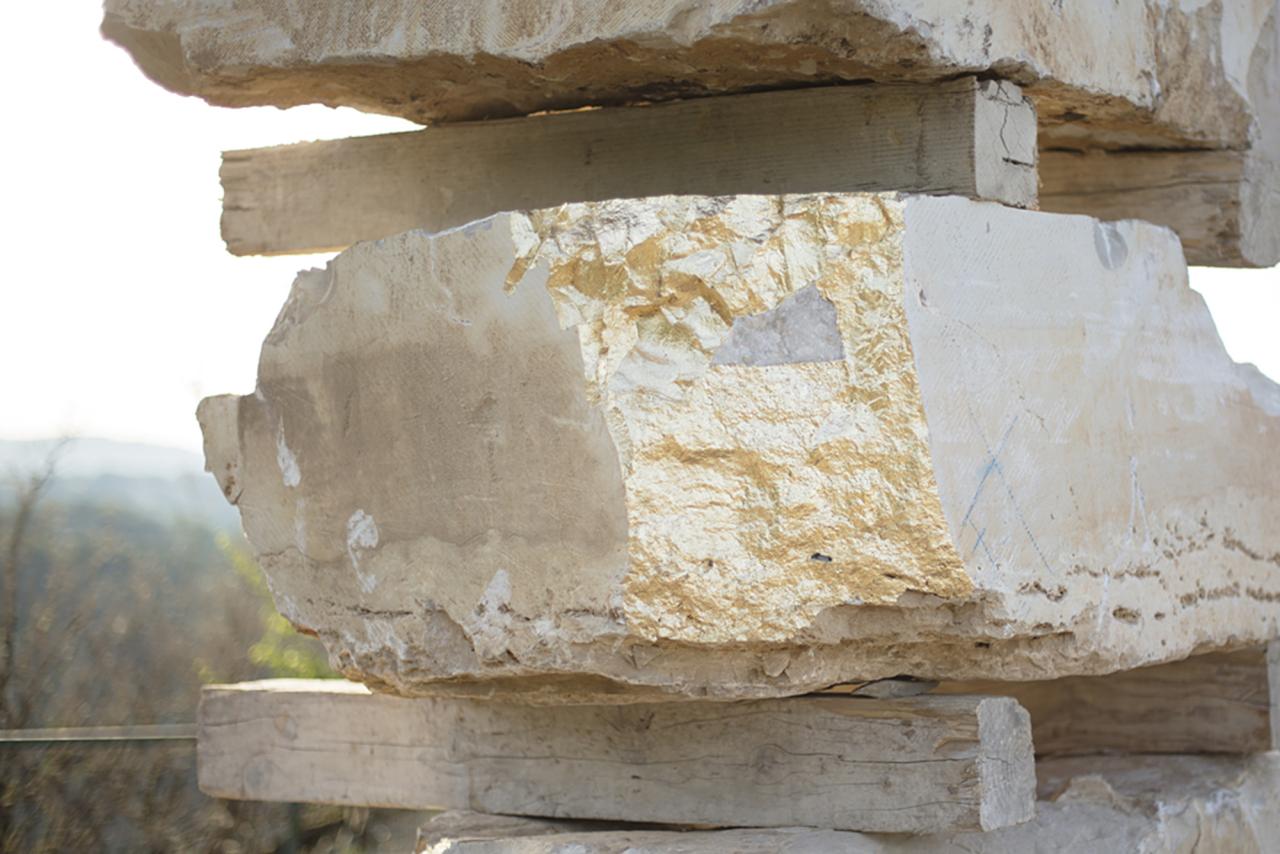Vous savez, mon ami, 2018, installation, bloc de calcaire, feuille d’or, photo Yohann Gozard