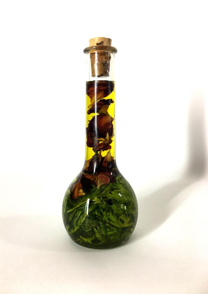 Disposée sur un tronc d’arbre, la précieuse potion, l’Extrait de magie verte (1), est contenue dans une petite fiole fragile, au centre du dernier espace. Comme le résultat d’une expérimentation chimique et alchimique, elle forme un concentré liquide, extrait de divers macérats huileux de plantes et de concoctions florales embaumant la salle.