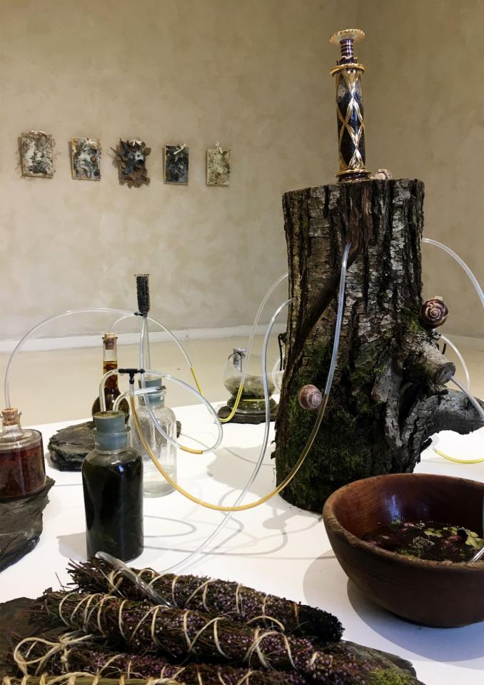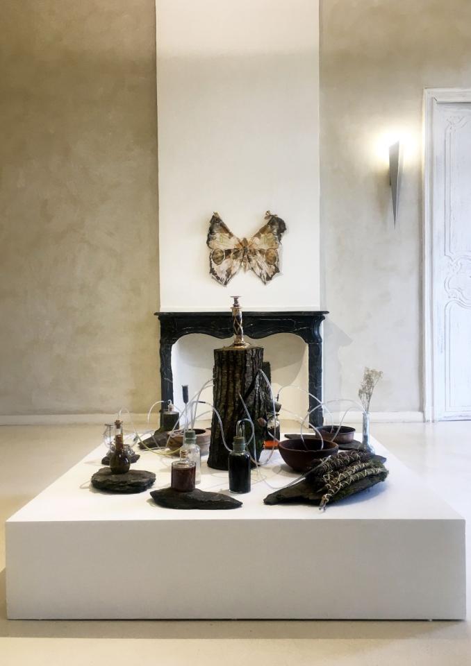 Extrait de magie verte (1), 2022, chestnut tree, old glasses, pvc tube, wood and copper container, schist, string, olive oil, vodka, honey, cider vinegar, water, salt, rapeseed wax, essential oils, indigo powder, dry plants, variable dimensions, solo exhibition views Pour des utopies sauvages, Château d’Assas, Le Vigan, France, 2022