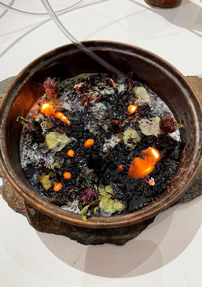 Extrait de magie verte (1), 2022, chestnut tree, old glasses, pvc tube, wood and copper container, schist, string, olive oil, vodka, honey, cider vinegar, water, salt, rapeseed wax, essential oils, indigo powder, dry plants, variable dimensions, solo exhibition views Pour des utopies sauvages, Château d’Assas, Le Vigan, France, 2022, detail