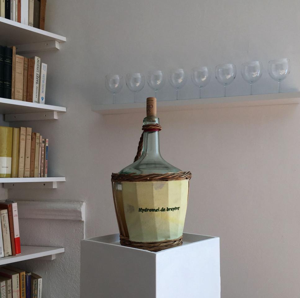 Extrait de magie verte (2), 2022, mead by heather, glass and rattan bottle, embroidery, fabrics, heather dye, pedestal, shelf, glasses, exhibitio view Abracadabra, with Audrey Martin, RIGA, Saint-Pierre-de-Trivisy, France, 2023