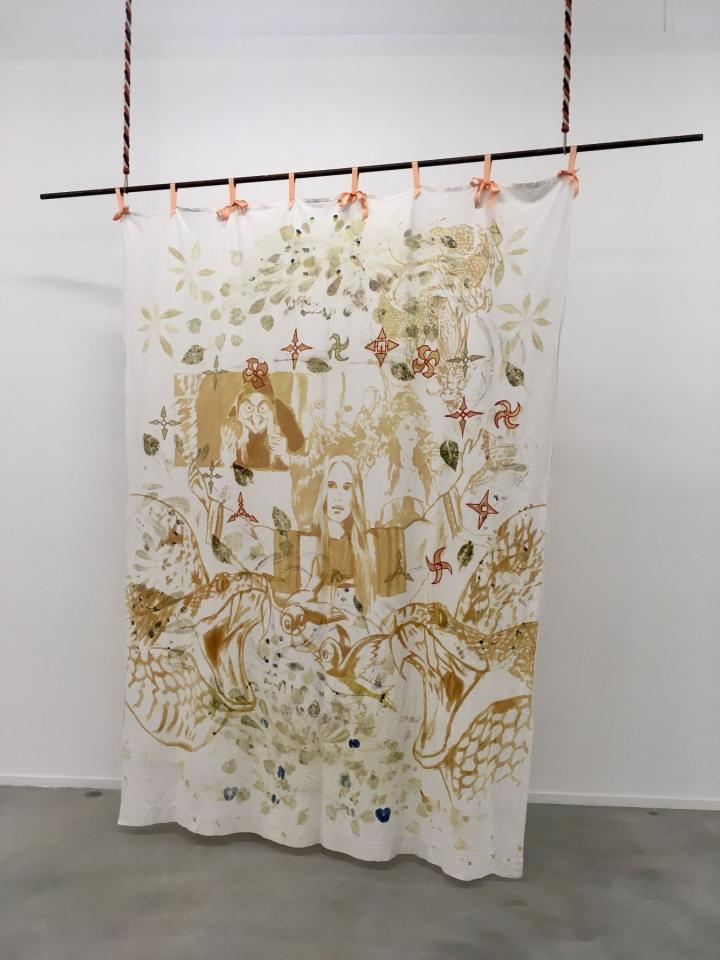 2020, iron acetate, plants print, embroidery threads, ribbon, canvas, 270 x 170 cm, groupe exhibition view Sol! La biennale du territoire #1 Un pas de Coté, MO.CO Panacée, Montpellier, France, photo Pauline Rosen-Cros