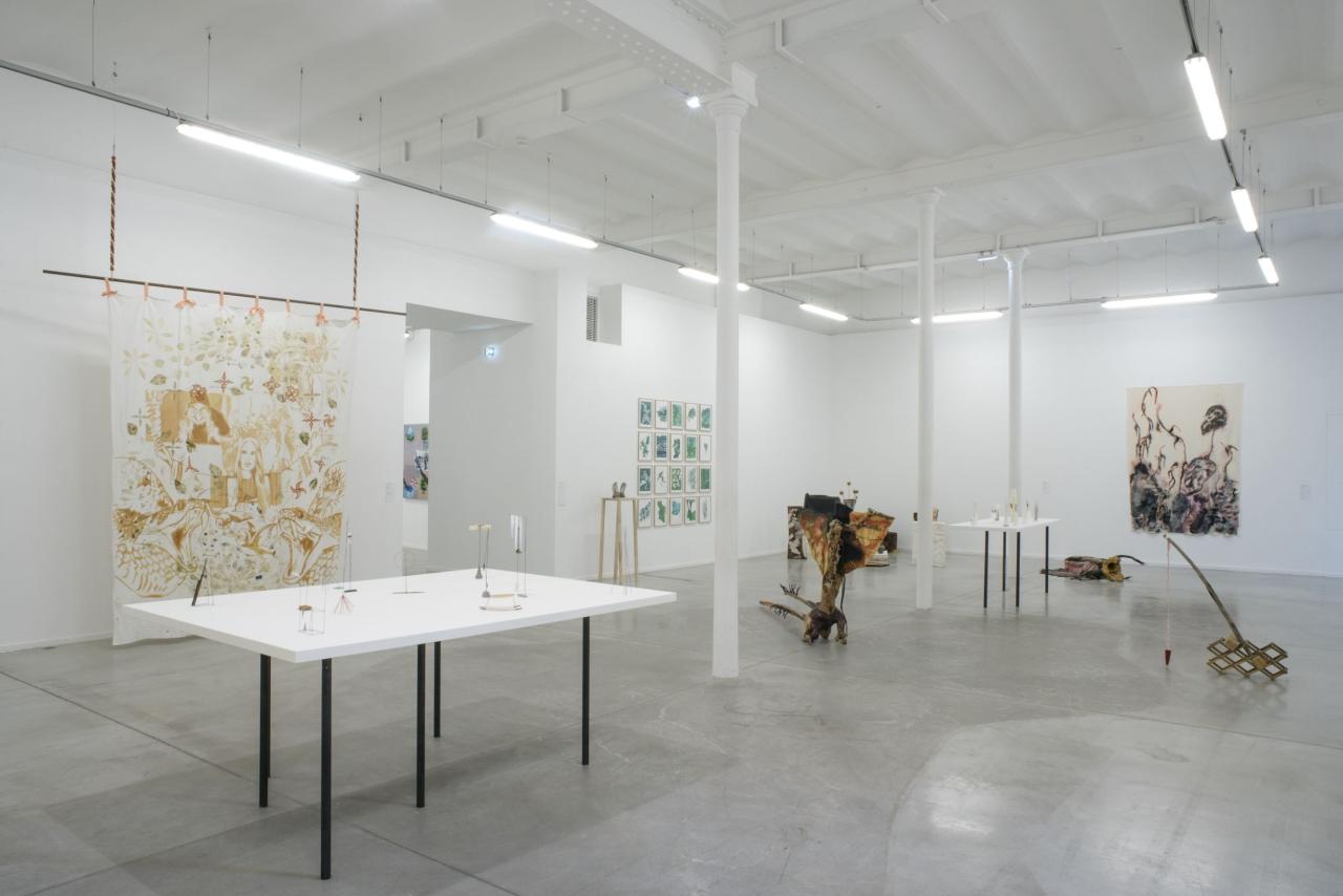 Margaux Fontaine puise dans un folklore générationnel et éclectique pour composer son propre univers, riche de symboles universels et de personnages récurrents. Engagée dans l’écoféminisme, l’artiste utilise la figure de la sorcière comme étendard pour porter un nouveau regard sur la puissance des femmes, l’inquiétude qu’elles suscitent révélant leur potentiel de pouvoirs. Elle neutralise les connotations caricaturales en multipliant ses modèles issus du monde du dessin d’animation, mais aussi d’autres cultures (japonaise, hindoue ou celte). Des indices d’ambivalences ponctuent les compositions complexes de ses grandes tentures peintes à la rouille de fer, ou martelées de feuilles.