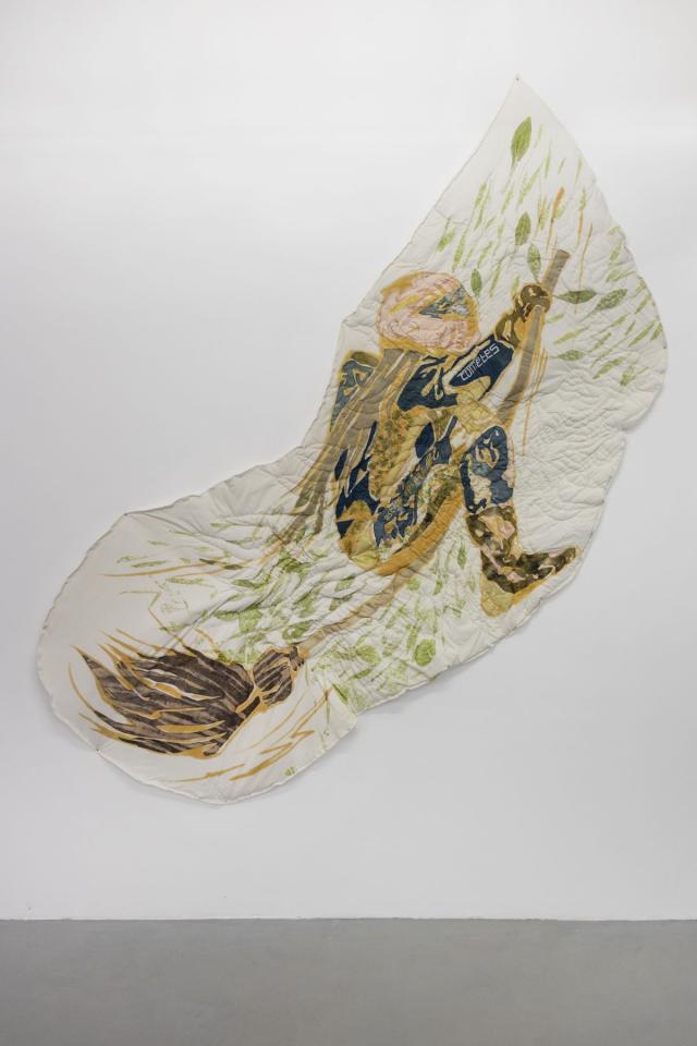 Le vent de l’hiver - Comètes sauvages En spirale astrale, 2022, iron acetate, flowers print, plant-based dye, threads, old linen, quilting fabric, 270 x 100 cm