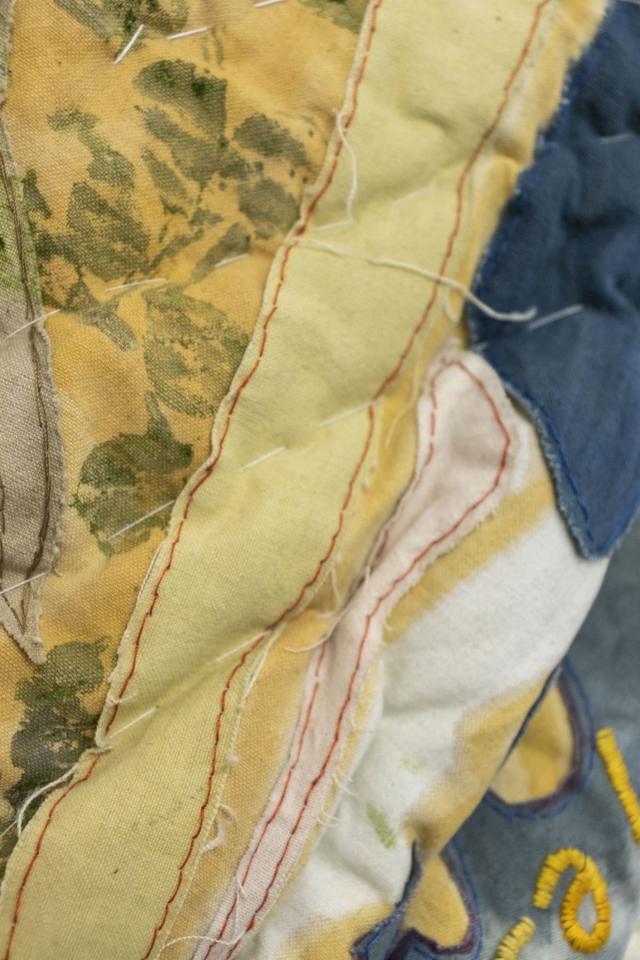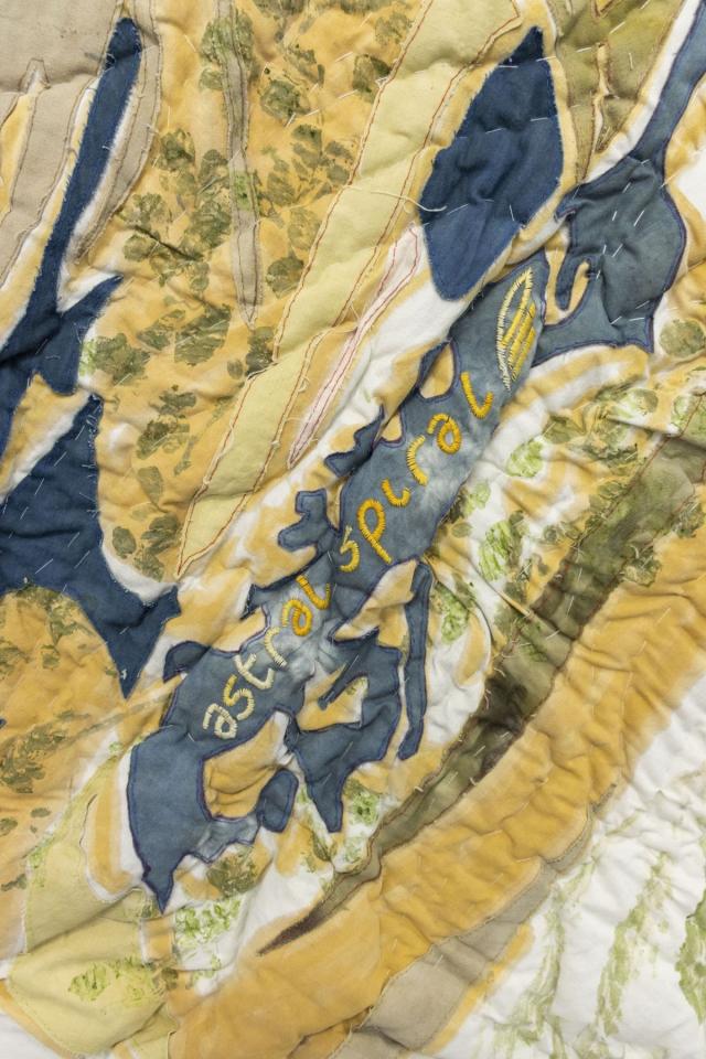 Le vent de l’hiver - Comètes sauvages En spirale astrale, 2022, iron acetate, flowers print, plant-based dye, threads, old linen, quilting fabric, 270 x 100 cm, details