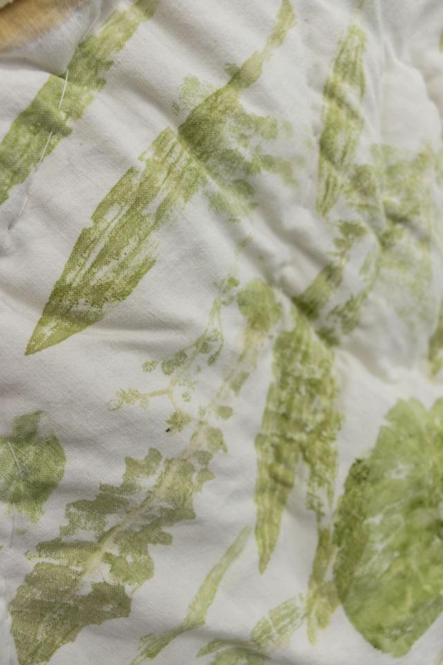 Iron acetate, flowers print, plant-based dye, threads, old linen, quilting fabric