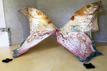 Margaux Fontaine puise dans le répertoire conceptuel textile à l’exemple d’Eva Hesse (1936-1970) ou dans celui du de la superposition d’images et de supports d’expression de Joan Jonas, née en 1936. Mais elle s’inscrit davantage dans la suite représentative et presque « naturaliste » de Kiki Smith, née en 1954. Une artiste qui a ouvert la voie aux thématiques de l’écosexualité féministe jusque dans ses dimensions érotiques et mystiques, poussant plus avant les propositions magiques restées confidentielles de la britannique Eleonora Carrington (1917-2011) ou de l’argentine Leonor Fini (1907-1996) à l’époque, déjà ancienne pour nous, du post surréalisme. Comme chez ses illustres aînées avec les références de leur époque, les éléments issus de la culture populaire, des dessins animés et de la bande dessinée sont insérés par Margaux Fontaine à des symboles ésotériques dans une auto narration sans cesse réécrite et dont les motifs entremêlés n’abandonnent jamais la figuration.