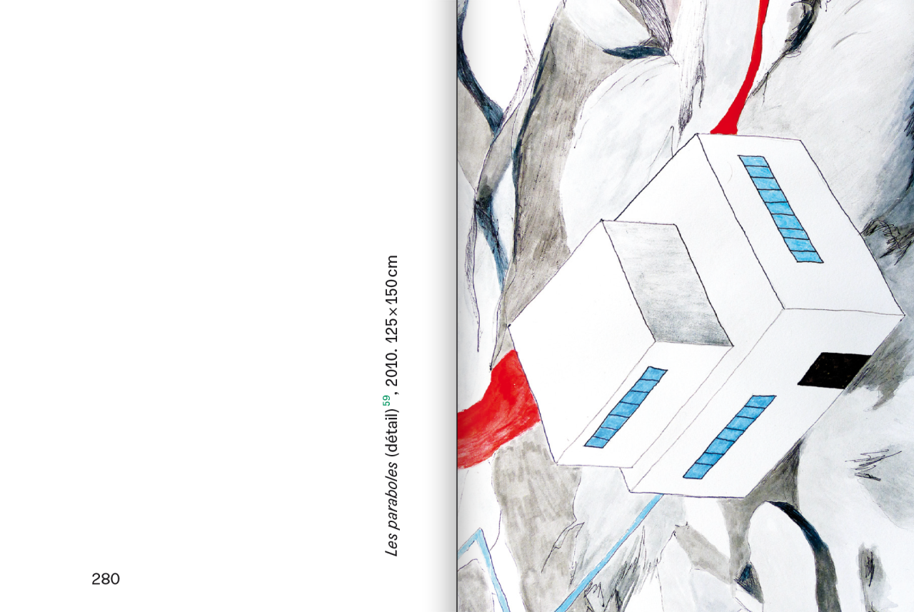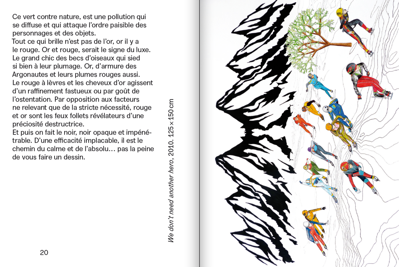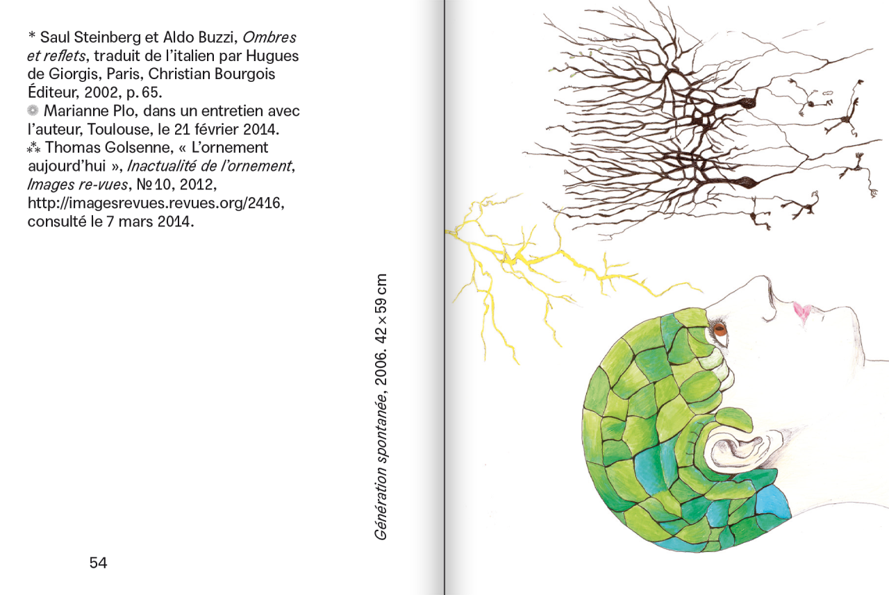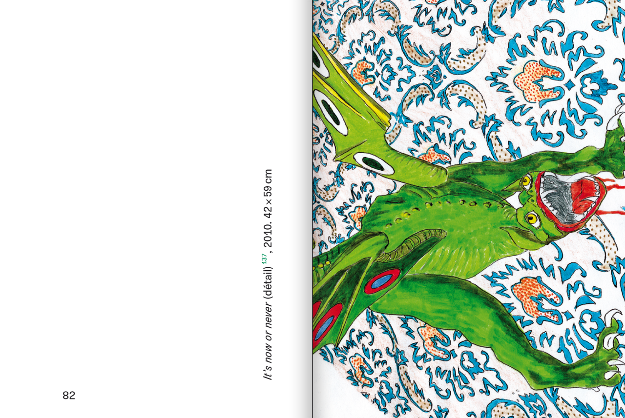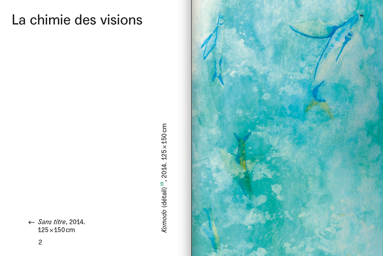La chimie des visions est une monographie. Elle rassemble, en son sein, des propositions, des expositions réalisées par l’artiste entre 2007 et 2014. La polysémie des projets impose un climat dense, tendu. Cet ouvrage est conçu tel un imagier qui laisse à voir un univers onirique fait de figures et motifs baroques. L’œuvre est foisonnante, l’objet-livre s’empare de cette richesse.