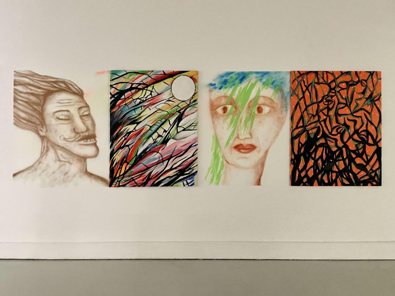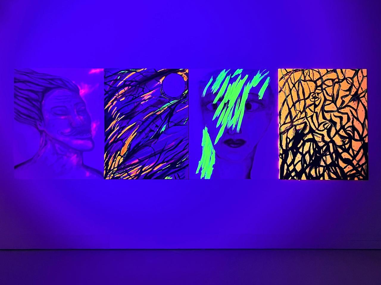 Post-Parfum, 2023, série de peinture et dessins sur papier et sur toile, 150 x 120 cm chaque élément, vue de l’exposition FLUO PARTY : art, mode, musique, 2023, La Fabrique, Toulouse