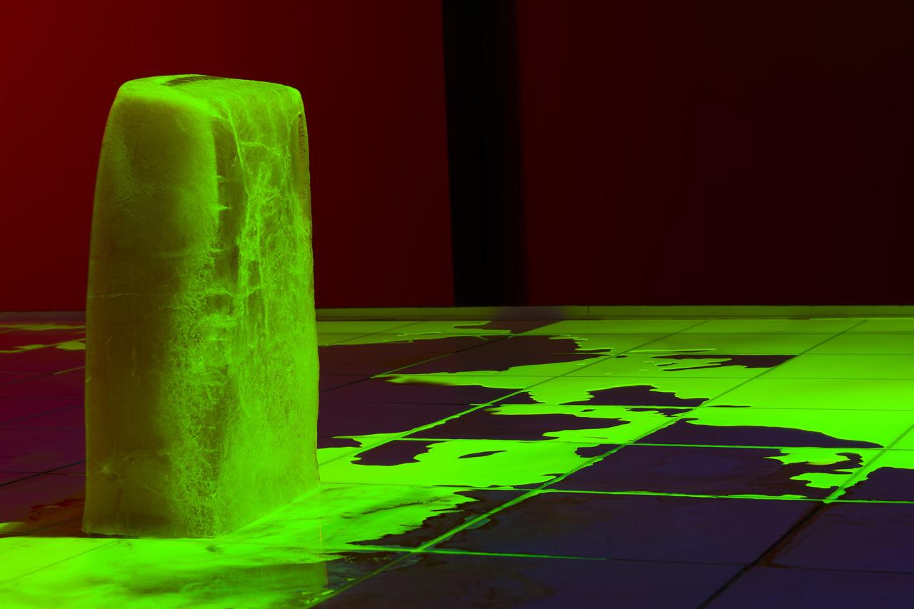 Angiographie, installation, 2018, glaçon de fluorescéine, lumière noire, carrelage, dimensions variables, photo Stéphane Migot