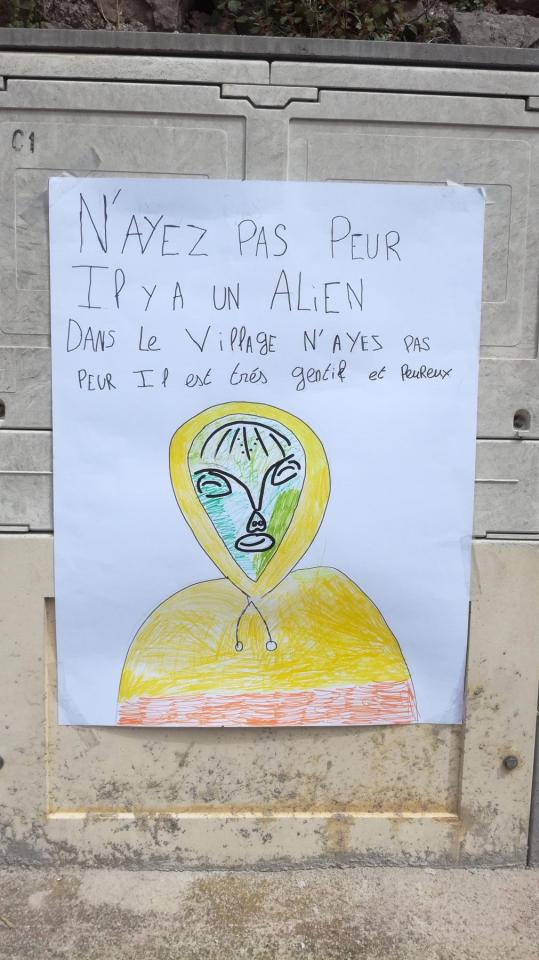L’Alien, 2019, jeu de rôle, détail, affiches réalisées par les élèves et placardées dans le village