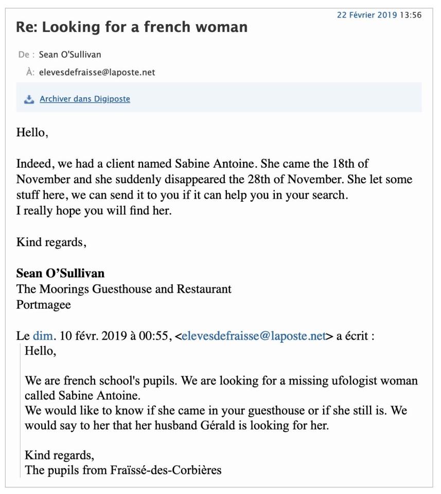 L’Alien, 2019, jeu de rôle, détail, élément d’enquête, échange entre les élèves et le gérant d’un hôtel en Irlande